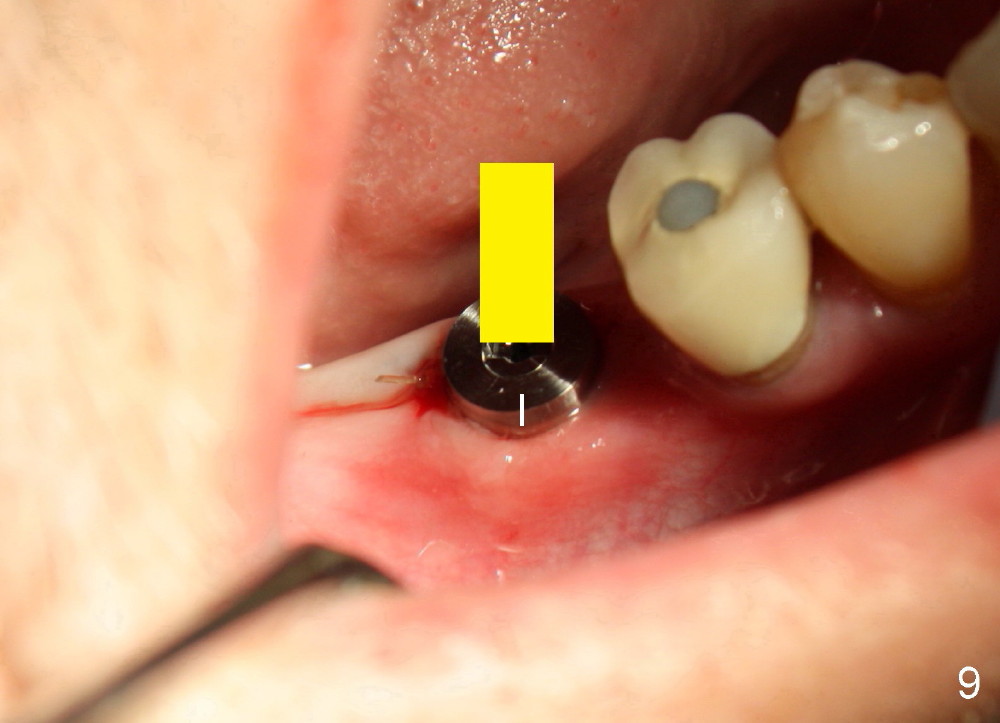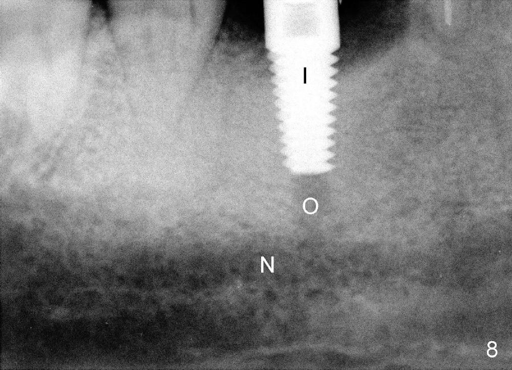 When the pilot drill is inserted into the initial osteotomy site for X-ray confirmation of its depth (Fig.7: D), the vertical block of the endo device (yellow rectangle) may be blocked due to the narrow divided edentulous space. The crown of the molar is shown, whereas the inferior alveolar nerve is not shown except a small portion in the left lower corner of Fig.7 (pink line). The depth of the further osteotomy (Fig.8: O) was chosen without accurate estimate. The integrity of the inferior alveolar canal (IAC) was violated, although the implant (I) was not placed that deep. The patient experienced transient postop pain, which was controlled by Medrol Dosepak. A correct way to prevent iatrogenic neuropathy in this situation is to remove the pilot drill, and place the endo device as deep as possible. The new X-ray should be able to reveal the relationship of the end of the osteotomy (shadow) to IAC. Measurement must be done using digital X-ray software over the new image to determine how deep osteotomy should be made (as shown in Fig.10). When an implant is placed (I in Fig.9: a second case as will be shown in Fig.10-12), the vertical block of the endo device can be placed on the implant. The sensor is placed deep into the lingual vestibule to show IAC in relation to the implant (Fig.8).