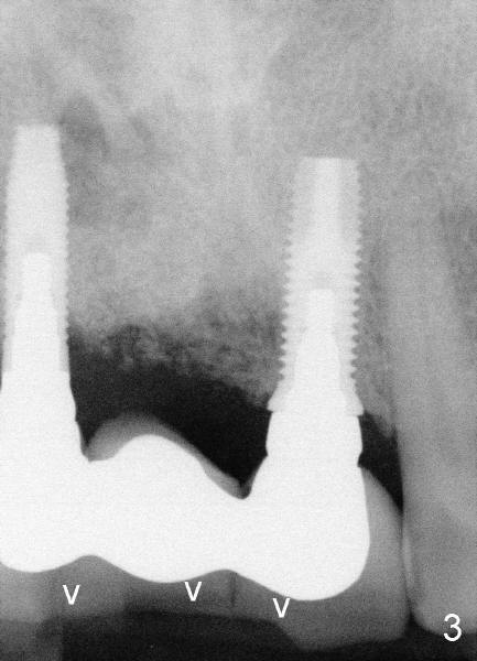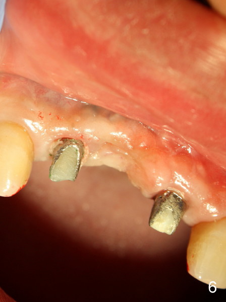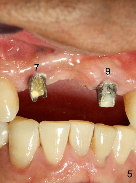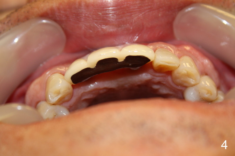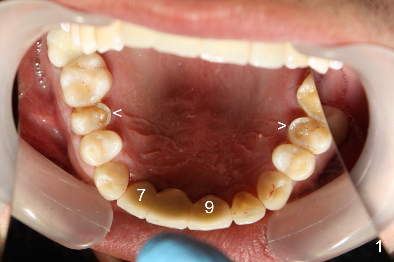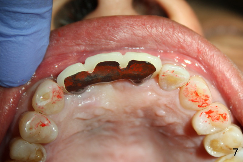 This time PFM FPD was fabricated with lingual metal as shown in Fig.4. The bridge was temporarily cemented on Feb. 09, 2011. Night guard was fabricated later. Unfortunately the bridge came off 7 months later and was recemented temporarily. Permanent cementation was not attempted, because of potential porcelain chip or implant/abutment screw loosening due to bruxism. Yesterday, the patient reported that the bridge was loose again. Today, #7 build-up changed from loose, disintegrated Cavit to more solid composite (Fig. 5 to 6). The bridge was cemented temporarily to avoid porcelain chip related to permanent rigid cementation. Fig.7 shows occlusal equilibrium after cementation. The patient felt that there was no premature contact to the bridge. What should we do next? Can we add an implant at the site of #8. Can this alleviate bruxism-related problems (easy decementation, porcelain chip and possible loosening of screw between abutment and implant)? Thanks.