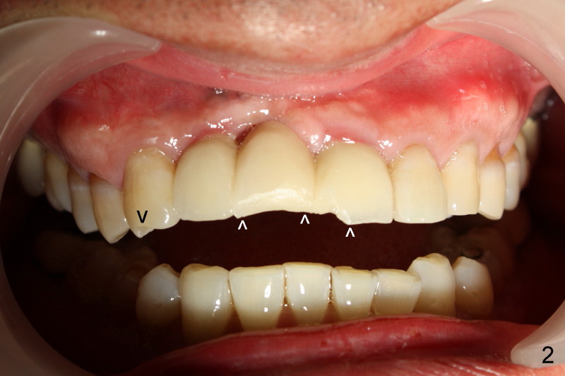 Fig.1 was taken when the new bridge was temporarily cemented (mirror view, Jan. 28, 2010). Arrowheads indicate enamel chip from the lingual cusps of the upper 2nd premolars. On Nov. 11, 2010, the bridge became loose again and was cemented permanently. Two months later (Jan. 27, 2011), porcelain chipped again as shown in Fig.2 and 3 (white arrowheads; black arrowhead points to wear facet of the tooth #6). The chipped bridge was removed.