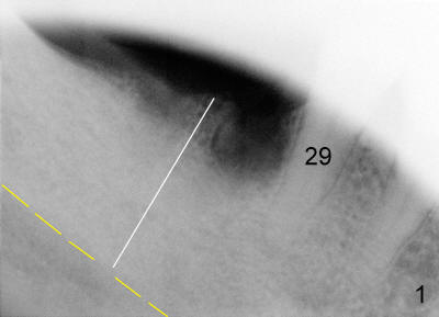 Mr. Chan is 58 years old and otherwise healthy. Three months ago, the tooth #30 was extracted due to vertical root fracture. He returned for implant placement. A pre-op PA was taken without measuring the bone height before surgery. The measurement of bone height (white line in Fig.1) from the ridge of the septum to the upper border of the inferior alveolar canal (IAC, yellow dashed line) was done postop. In fact, it is 17 mm. Effort was exerted to make osteotomy in the septum and parallel to the long axis of the tooth #29. When 2.5x17 tapered drill reached the depth, the patient felt pain. PA was taken (Fig.2). This time the invasion of IAC was overlooked again from the X-ray (Fig.2 white line). The black line indicates the length of the drill (17 mm). So far local infiltration had been used. It was thought that pain was due to incomplete anesthesia. After inferior alveolar nerve block, osteotomy was finished until 6x17 mm with combined bone expansion with Tatum osteotomes and drilling (Fig.3). The invasion of IAC was obvious. The base of the osteotomy was soft (probed with a thin curet) and the depth is more than 17 mm (explorer). Tatum tapered implant (6x17 mm) was placed 2-3 mm short of osteotomy depth (Fig.4). The tapered implant is originally designed to be placed supragingivally.