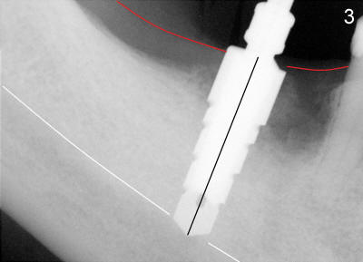 The lesson learned from this case is that it is very important to take a good pre-op PA that includes IAC. Take time to trace IAC and measure the bone height. Digital image software used in this office (Cliniview) has a measurement program. It is pretty precise, with deviation not more than 1-2 mm. If you are not sure of boundary of the IAC, choose shorter drills, osteotomes and implant. Although CBCT is precise, it may be not available or indicated for every case. For a simple case such as this one, careful analysis of well-taken PA is often good and safe enough to place an implant in the posterior mandible.
