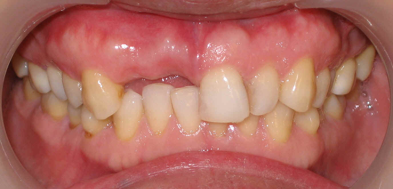 Fig.1 (magnification): deep overbite and moderate deep overjet may be the reason that the incisal edge or cingulum is not a reliable anatomic landmark to determine site and angulation of implant placement. Back to main text