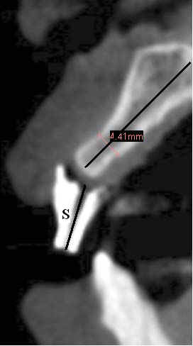 Fig.6 (magnification) The long axes of the drill sleeve (S) and of the alveolar ridge are not aligned. Back to main text