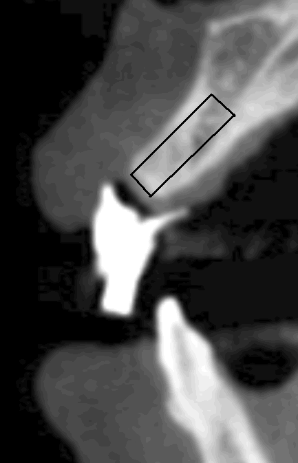 The originally designed long axes of implants at the tooth #7 (Fig.6) and #8 (Fig.7) are determined by wax-up, but they are not aligned well with the long axis of the alveolar ridge. In fact, the long axis of the natural tooth (#9 in Fig.8) is also not coincided with that of the ridge. That is, the root of the right central incisor is not inserted in the middle of the ridge. This orientation is good from the prosthetic point of view, but we cannot place the largest and longest implant, or fenestration is most likely to happen labially. An oral surgeon would like to place an implant (black box) along the long axis of the ridge (Fig.7'). Back to main text