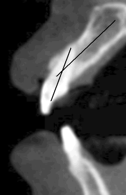Fig.8 The long axes of the tooth #9 and the alveolar ridge are not coincided. That is, the root of the central incisor is not inserted into the middle of the ridge. For implant stability, we need to place the implant in the middle of the ridge. Back the main text