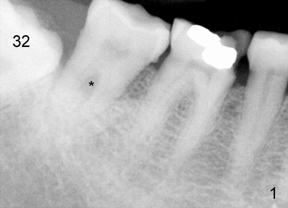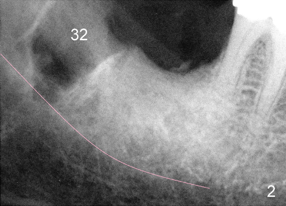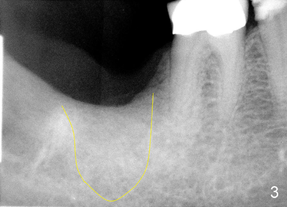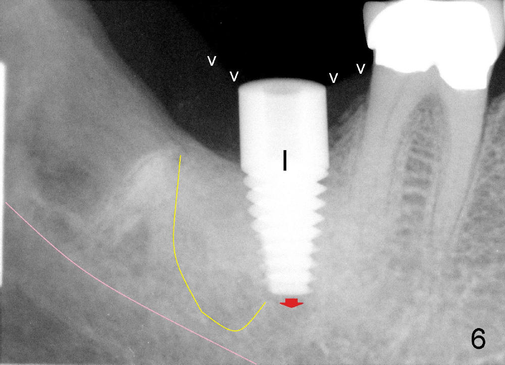Mrs. Hwang in her sixties has had periodontal disease in her lower right 2nd molar (Fig.1 *). Three years later, both the 2nd and 3rd molars are extracted (Fig.2; pink: the upper border of the inferior alveolar canal). Four months after extraction, the patient returns for implant placement at the site of #31 (Fig.3, 4). The socket of the 2nd molar is outlined in yellow in Fig.3.