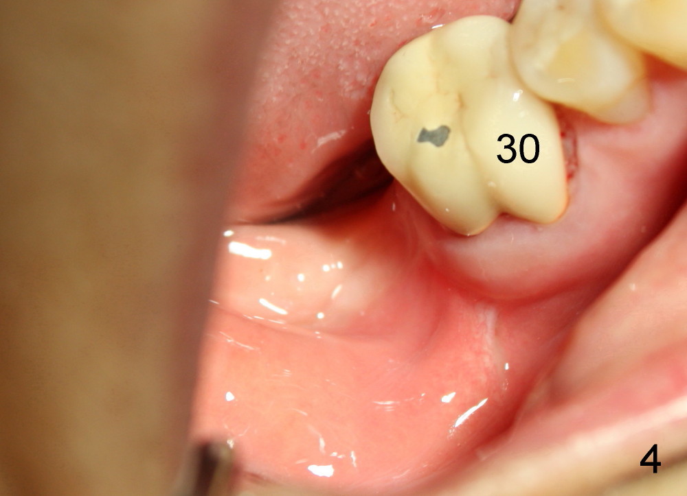 The 2nd molar has notoriously short clinical crown (height). Presumably there will be a lot of grinding of the unipost placed upon the implant for this case. Or we will need to cut off the top of the unipost precisely. This patient will return for unipost placement and crown restoration next week, four months after implant placement. We will report what is going to happen. Shorter abutments may have their application in our daily practice, such as narrow vertical dimension (this case), supraeruption and young guys (1,2). We do not have to trim or cut the unipost. Implant dentistry has much more fun and less risk, including wetting my pants!