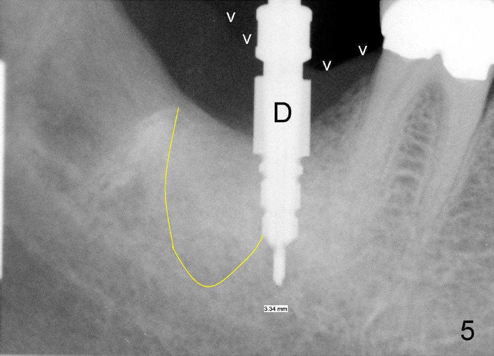 An intraop PA is taken with 4x14mm tapered drill in place (Fig.5 D). It appears that the osteotomy is deviated to the mesial portion of the healed socket (yellow outline). While the top of drill is at the gingival level (arrowheads), the tip of drill is 3.34 mm from the inferior alveolar nerve.