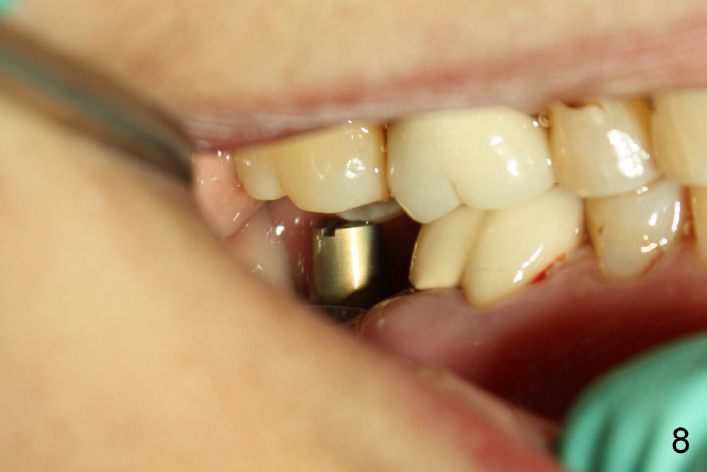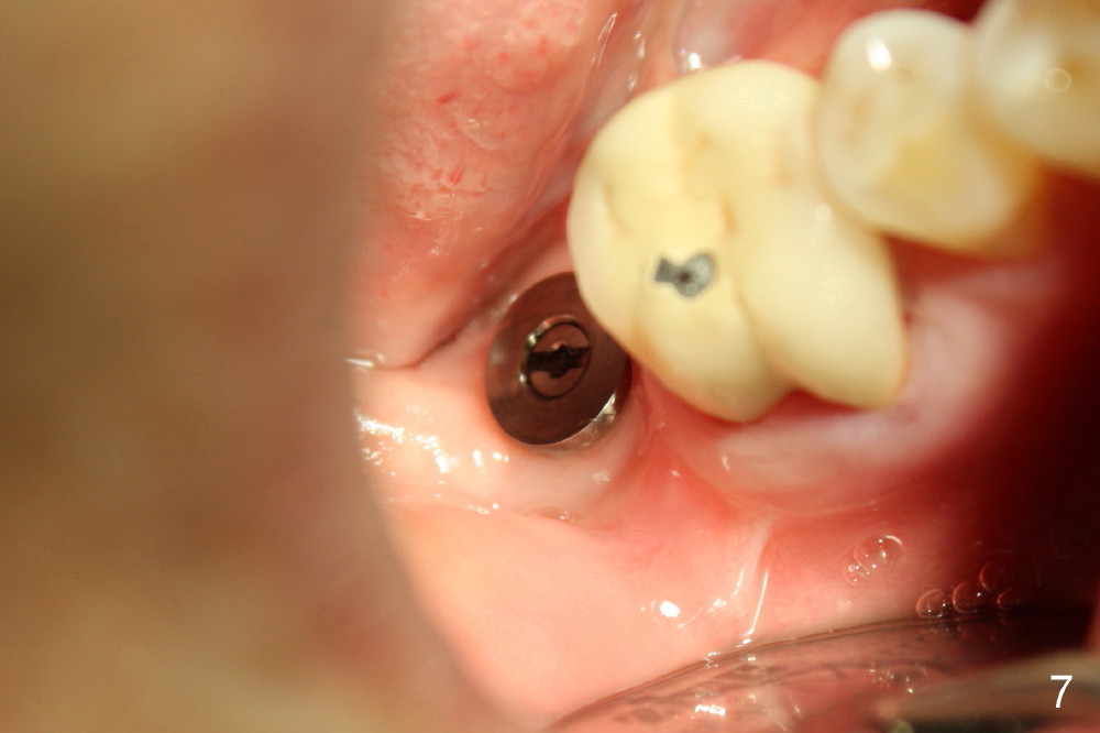 Today the patient returns for implant restoration 4 months after placement. The tissue around the implant is healthy. It appears that there is plenty of clearance (Fig.7). How much I wish no gross reduction!