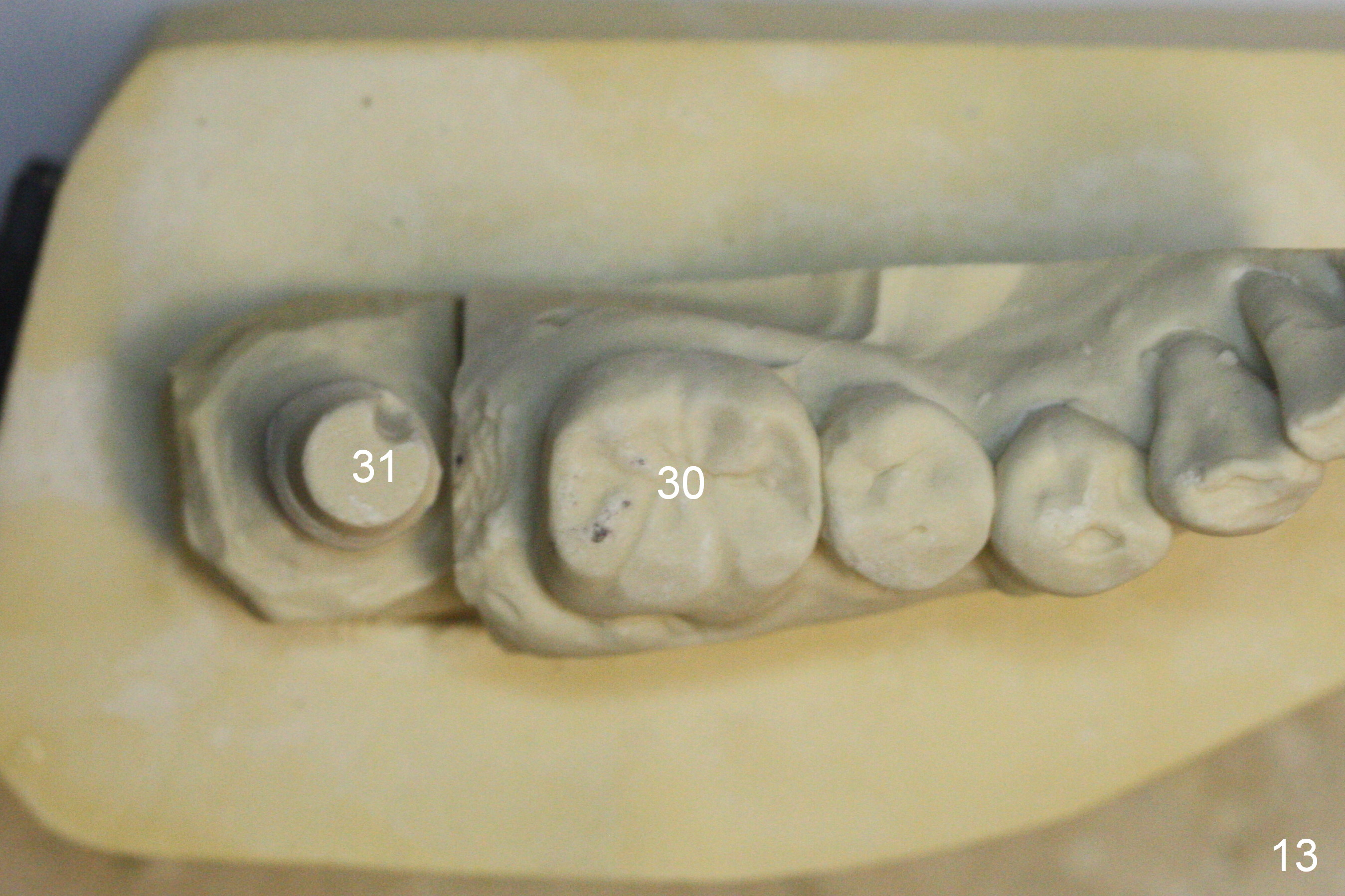 Three years 8 months post cementation, the crown dislodged. A 5x3 mm 0 ° unipost is resin bonded. Retrospectively the angled abutment appears not necessary (Fig.13 (occlusal view), 14 (posterior view)). Fig.12 is taken immediately post cementation of redo crown. There is no bone loss.