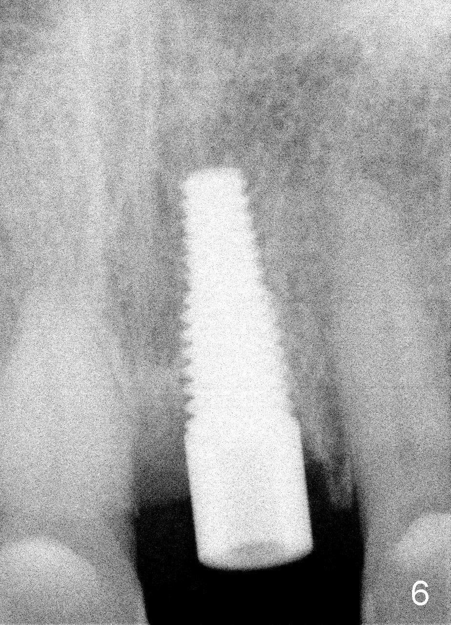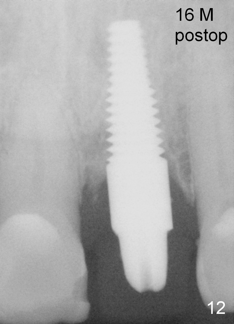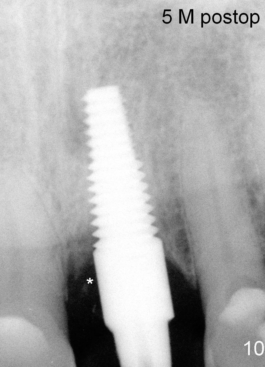 Fig.10: five months postop with immediate provisional. Bone immediately next to the rough surface of the implant undergoes remodeling (*).