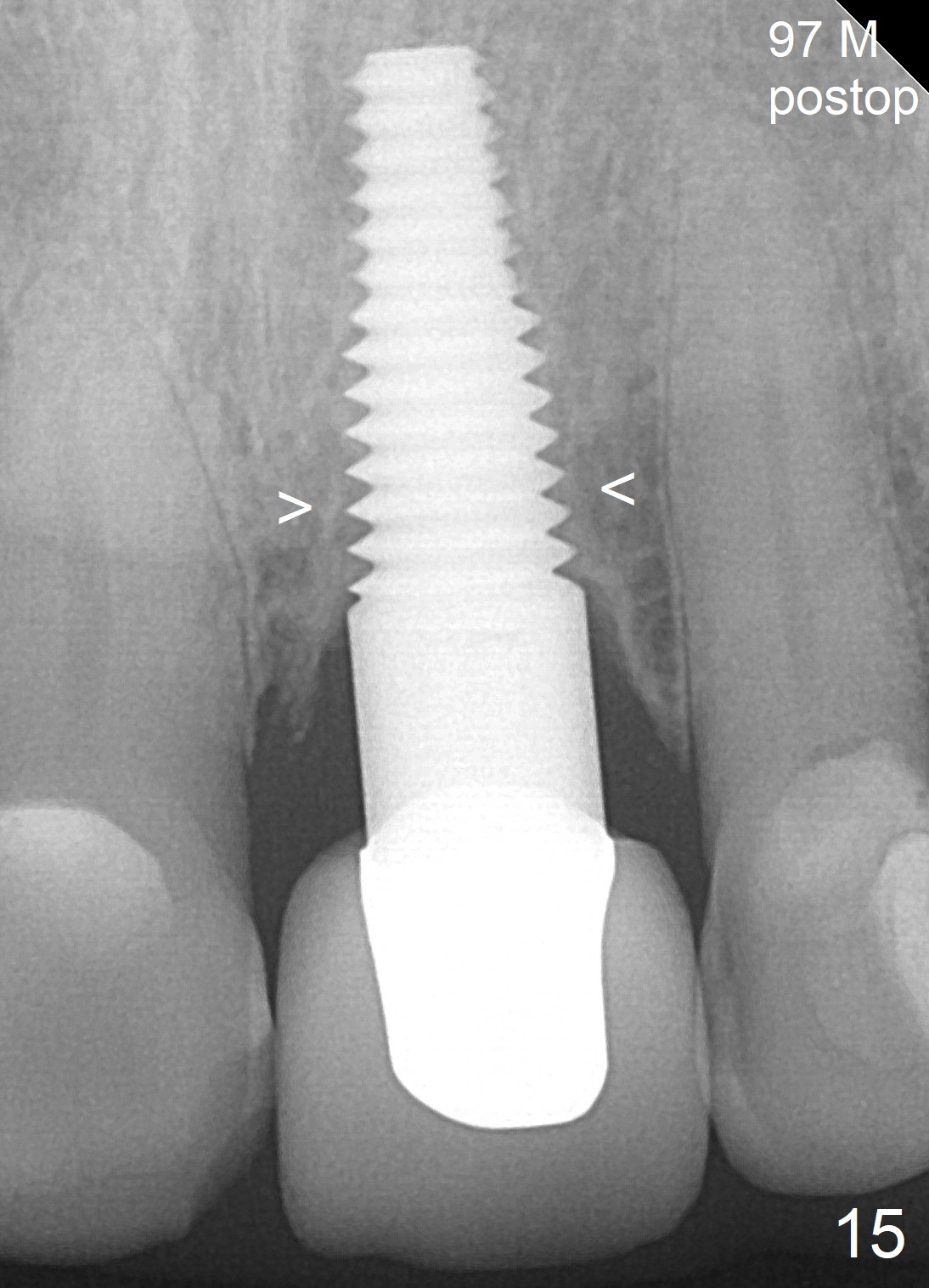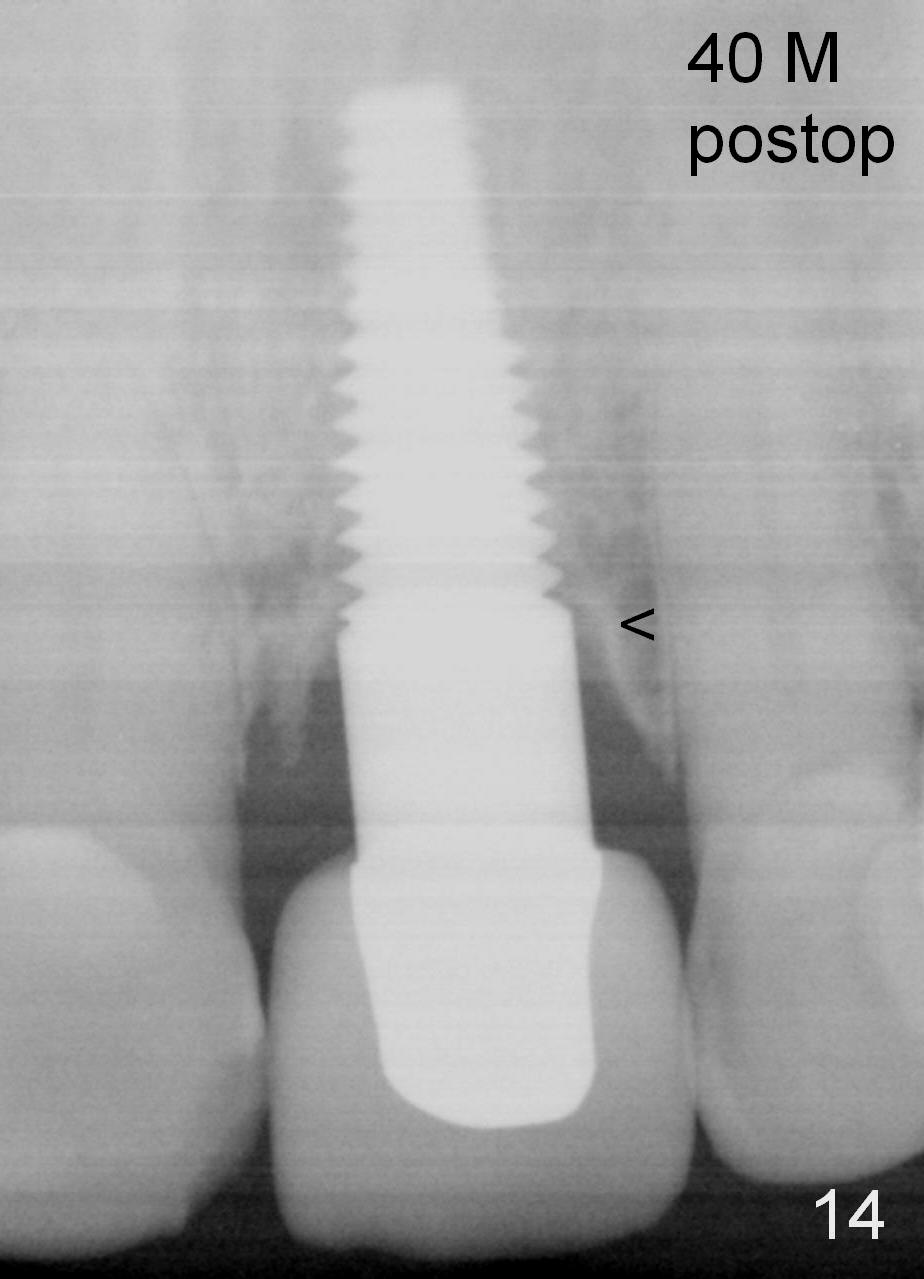 Fig.15: 97 months postop (2.5 years post cementation). The cortical bone extends apically along implant threads (<).