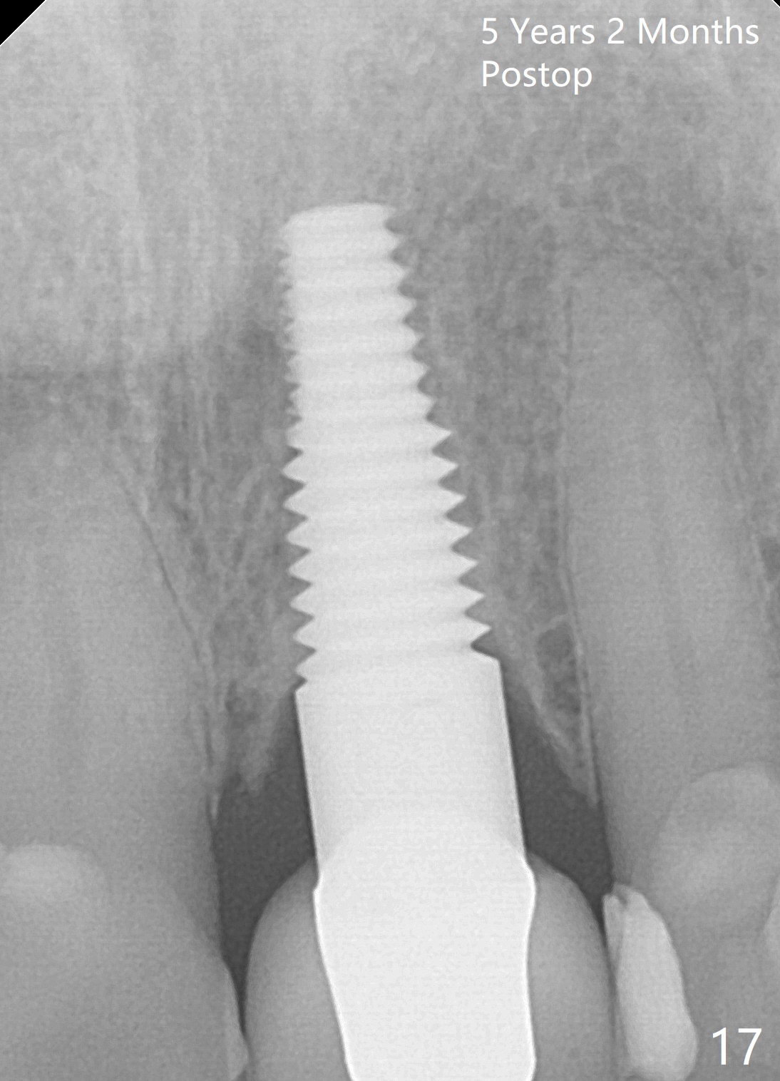 Although there is no bone loss around the implant (Fig.17), metal starts to show 5 years 2 months postop (Fig.18 ^), probably related to the buccal placement, too large the implant for the site or buccal plate atrophy (Fig.19).