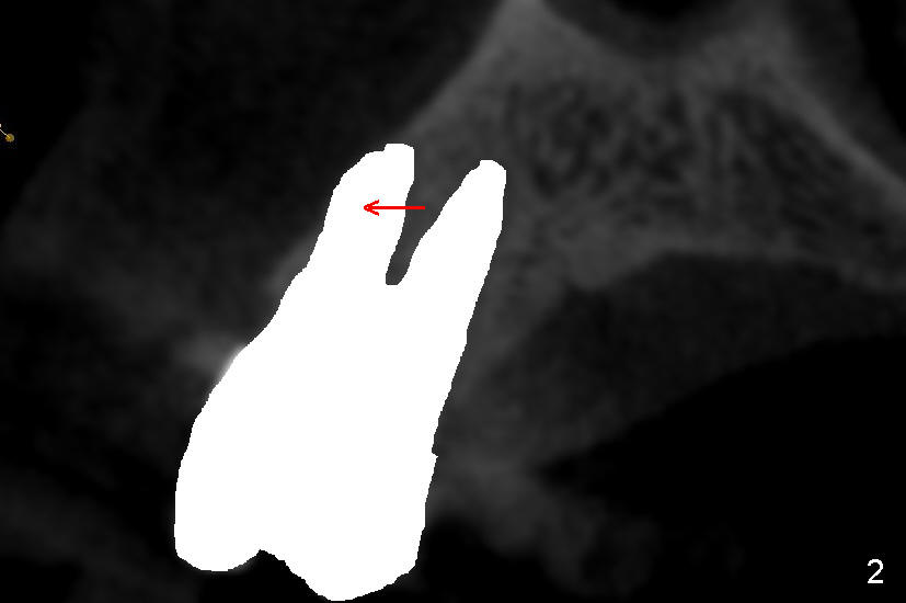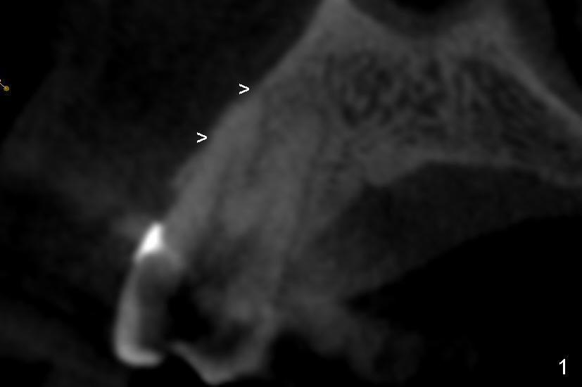 It is known that that buccal wall (apical) of anterior teeth including bicuspids is thin (Fig.1 between arrowheads). Fig.1 is a CT coronal section of an upper first bicuspid, whereas Fig.2 is a diagram showing after extraction. We are going to show how immediate implantation is to push the septum buccally (arrow) to close the buccal apical defect.