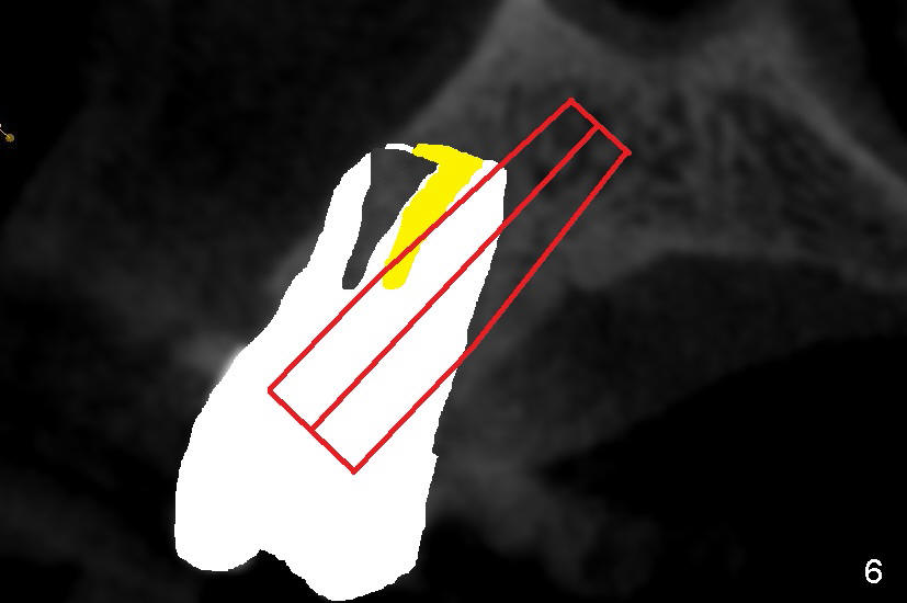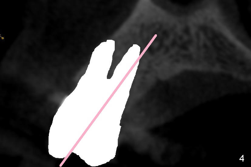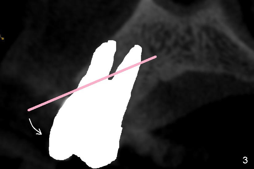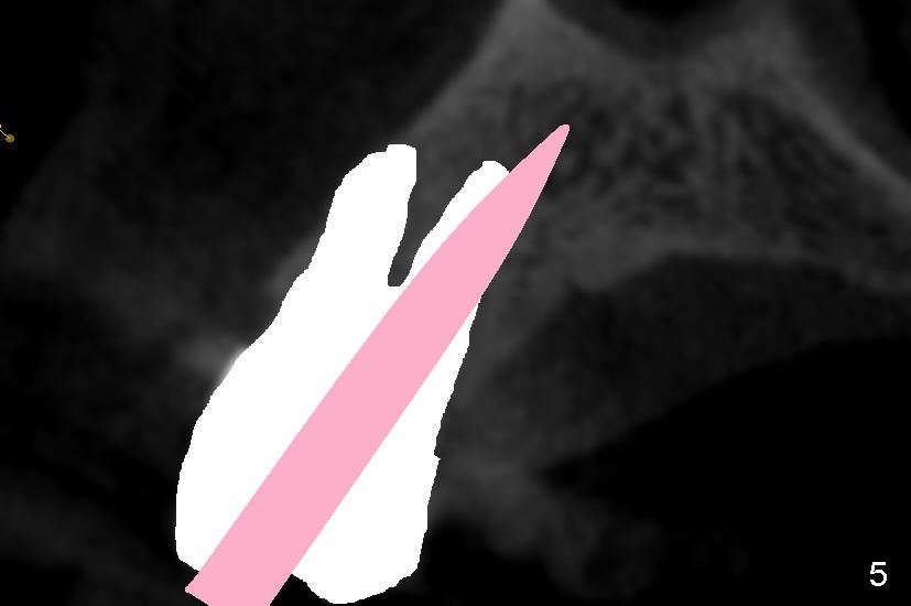 Even in a single root socket, osteotomy is to be created in the palatal wall. To get a "catch", a drill or osteotome (RT for example; Fig.3 pink line) is placed more or less perpendicular to the palatal wall. Once the catch is achieved, the axis of osteotomy is changed (Fig.3 curved arrow), more or less parallel to the bone morphology (buccal and/or palatal walls, Fig.4). Gradually the osteotomy is increased in diameter (Fig.5 pink area). In the single root, a separate, palatal socket has been created with formation of a septum. Subsequently, taps and the implant (tapered, Fig.6 red portion) will push the existing or just formed septum buccally (from yellow area to grey area). The fractured and displaced septum is going to participate in repairing the buccal apical defect if the pre-existing infection is under control under protocol proposed by Tatum group.