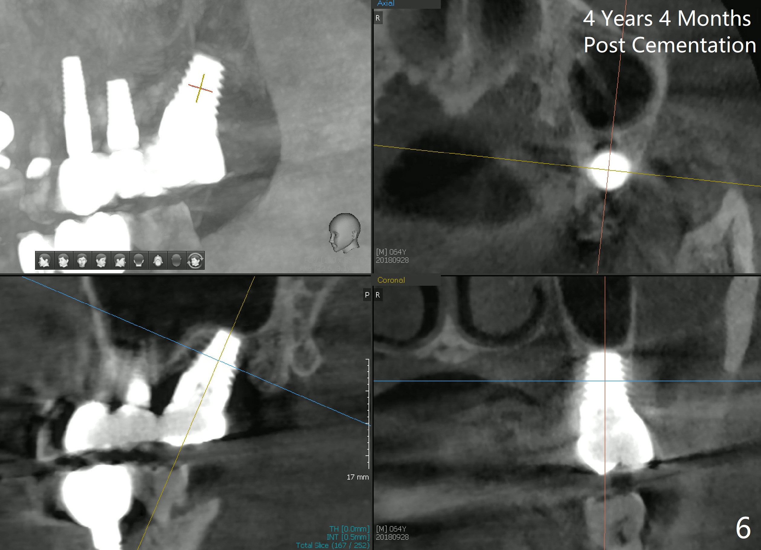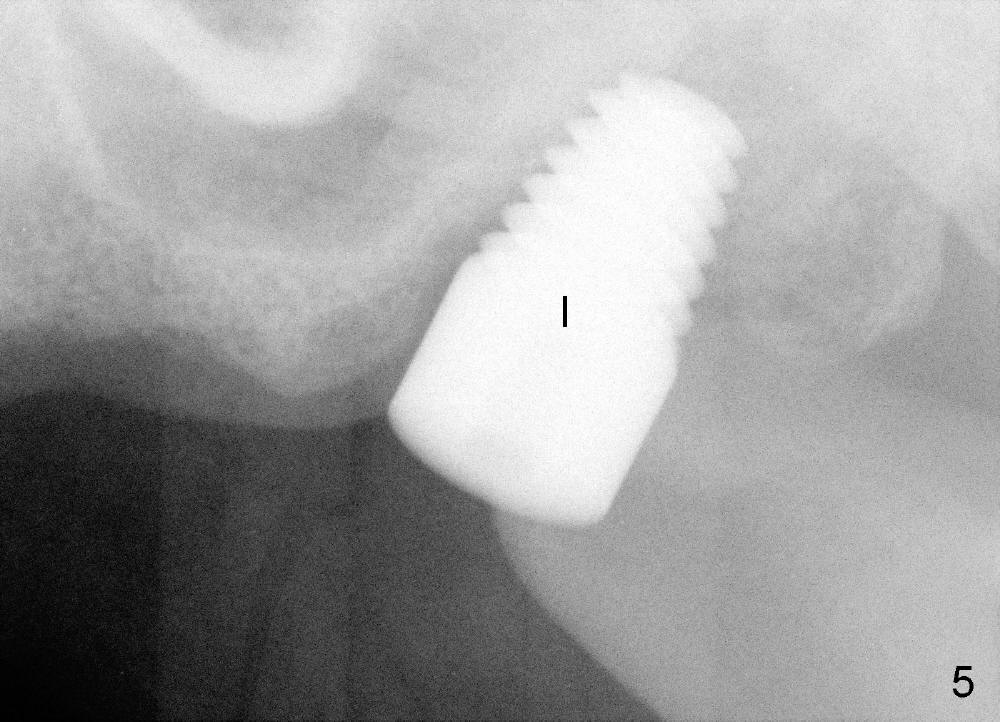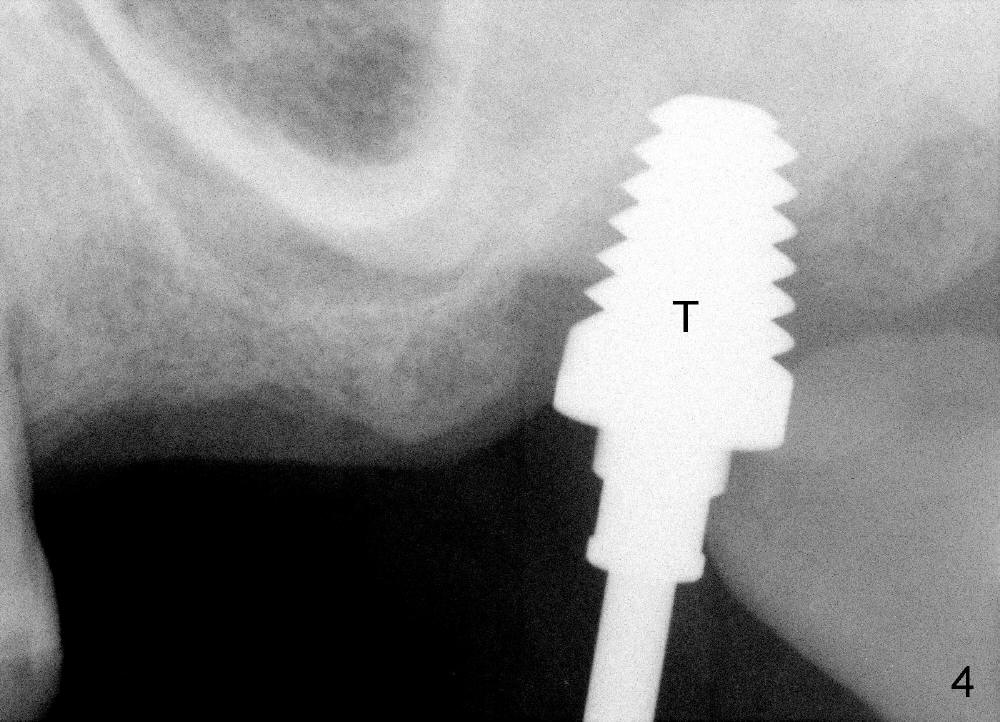 In fact, a tapered tap of 8x14 mm was used (Fig.4 T) before the implant of equivalent size was placed (Fig.5: I). The patient and the implant are doing fine after surgery. No bone loss is noted 4 years 4 months post cementation (Fig.6).