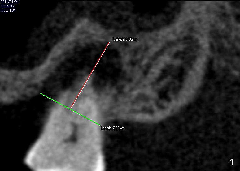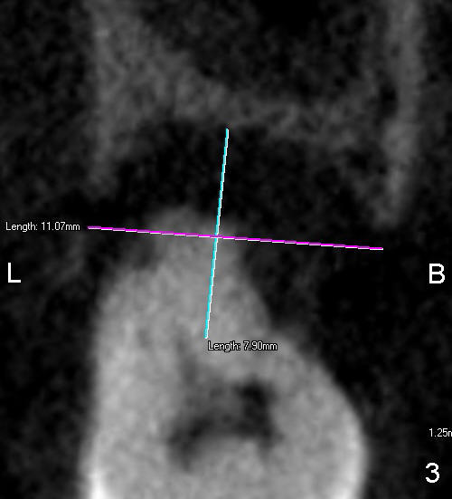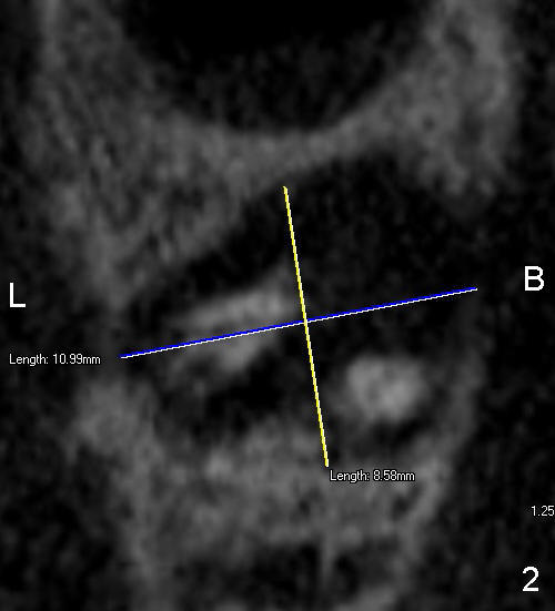 Measurement of the socket of #15 is done to determine the size of implant to be placed immediately after extraction. Fig.1 is a section showing the mesiodistal dimension of the 2nd molar, whereas Fig.2 and 3 are axial and coronal sections at the midroot level, respectively. Is 8x11 mm screw implant appropriate?