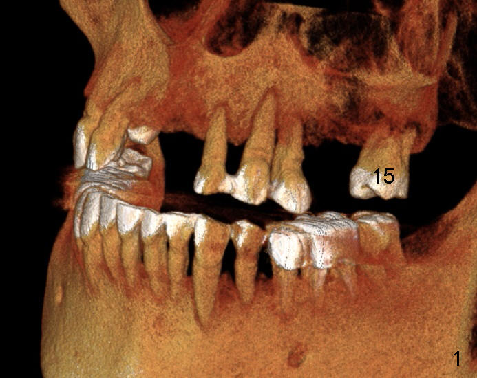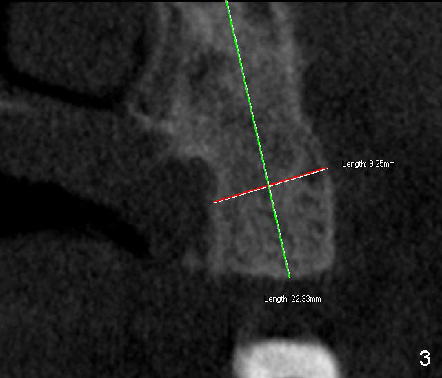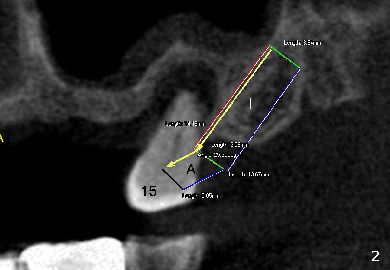 A fifty-eight-year-old man has had an upper partial for a while. One of abutment teeth, #15, is loose (Fig.1,2). He is willing to do anything except not using the existing partial. Our plan is to extract #15, place an implant (4x14) in the 3rd molar area oblique, place an angled abutment, place a crown at the site of #15 and finally reuse the partial (Fig.2). Fig.3 is a cross section through the long axis of the presumptive implant drawn in Fig.2.