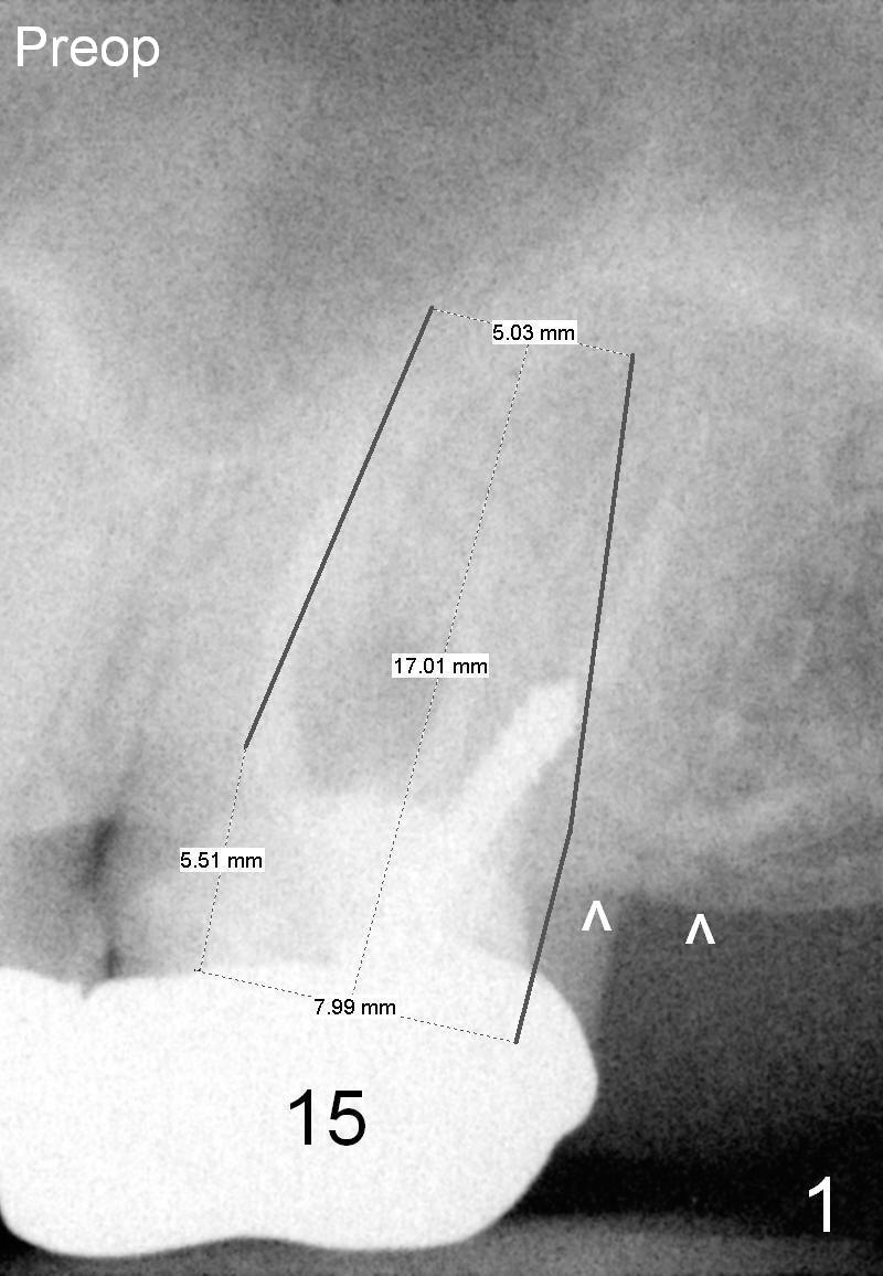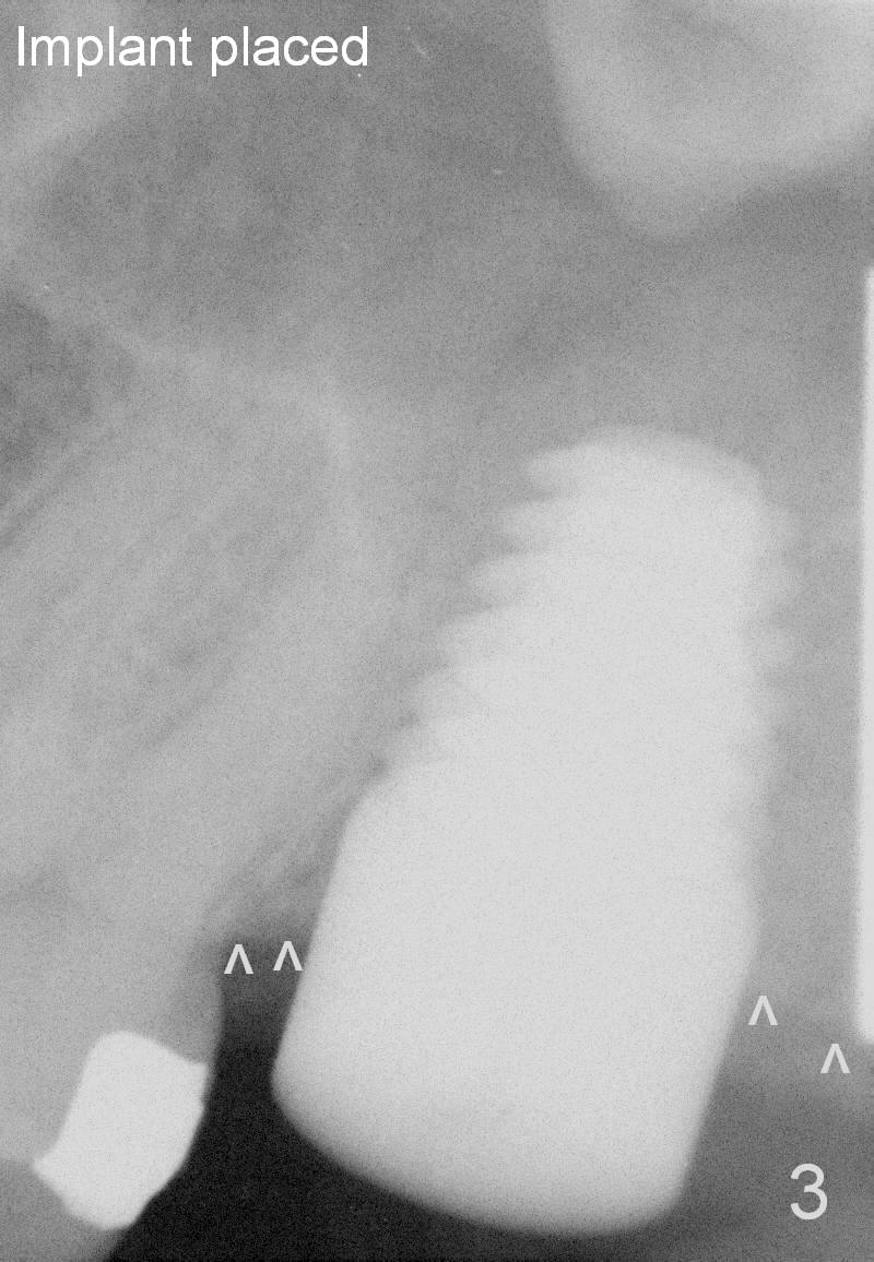 The tooth #15 is going to be extracted due to repeated furcal infection; the distal crest appears to be flat (Fig.1 ^). Two and a half months post extraction, a 6x17 mm tap is placed (Fig.2) prior to placement of a 8x14 mm tissue-level implant (Fig.3). It is apparent that the crest bone has started bone loss (^).