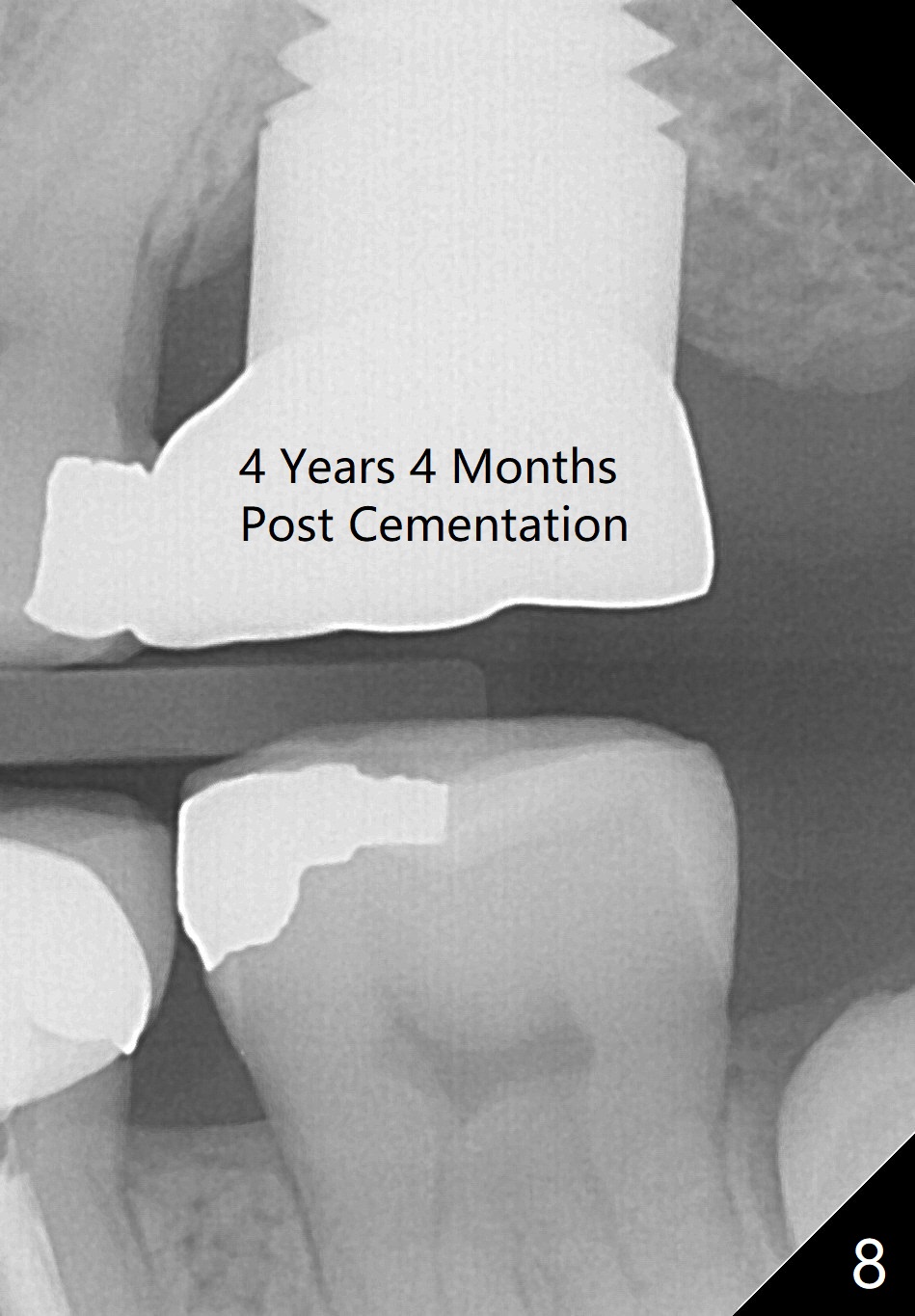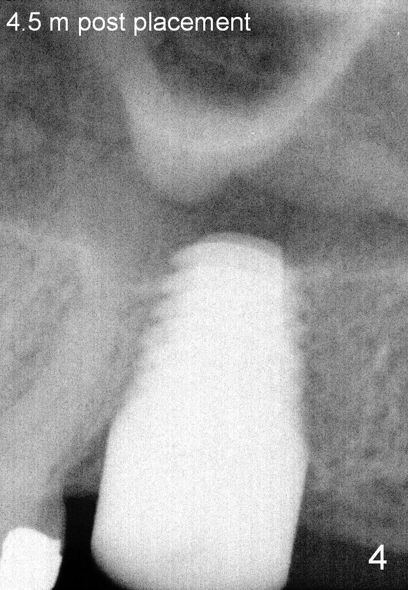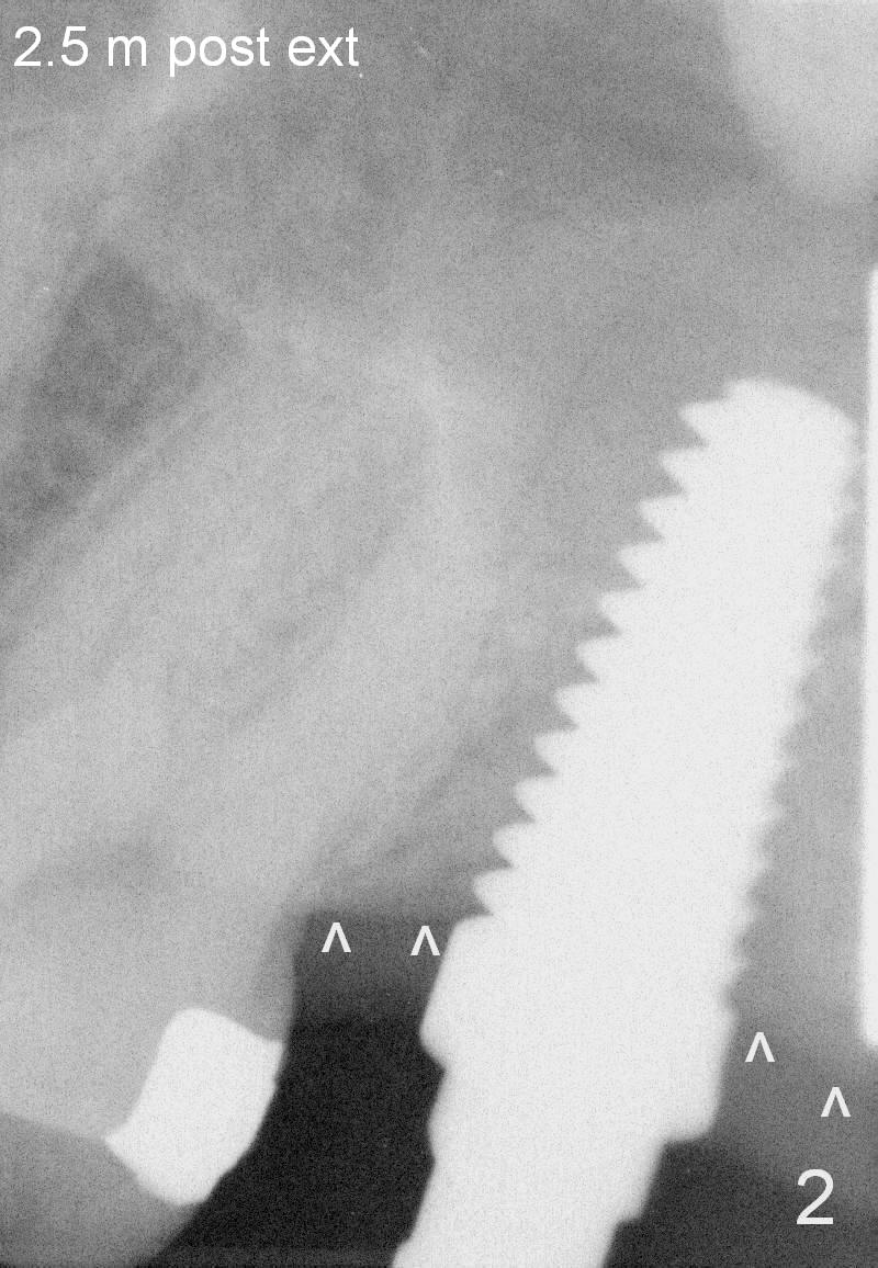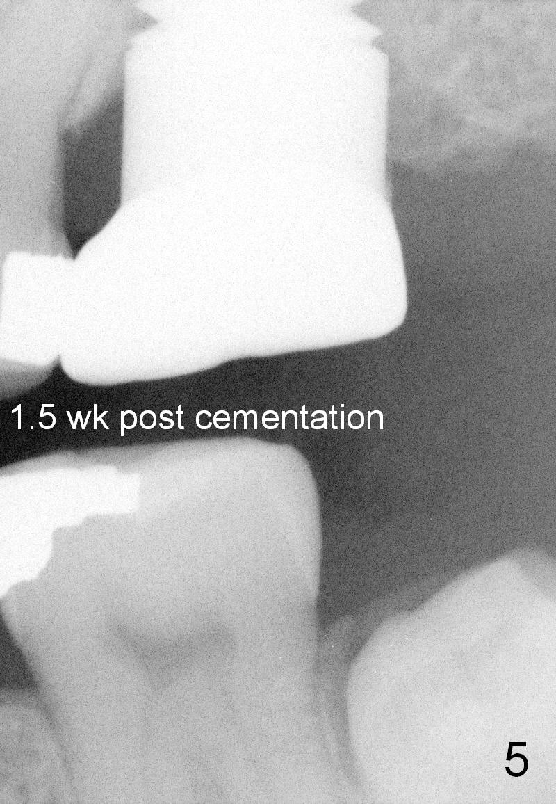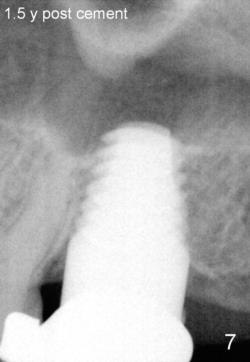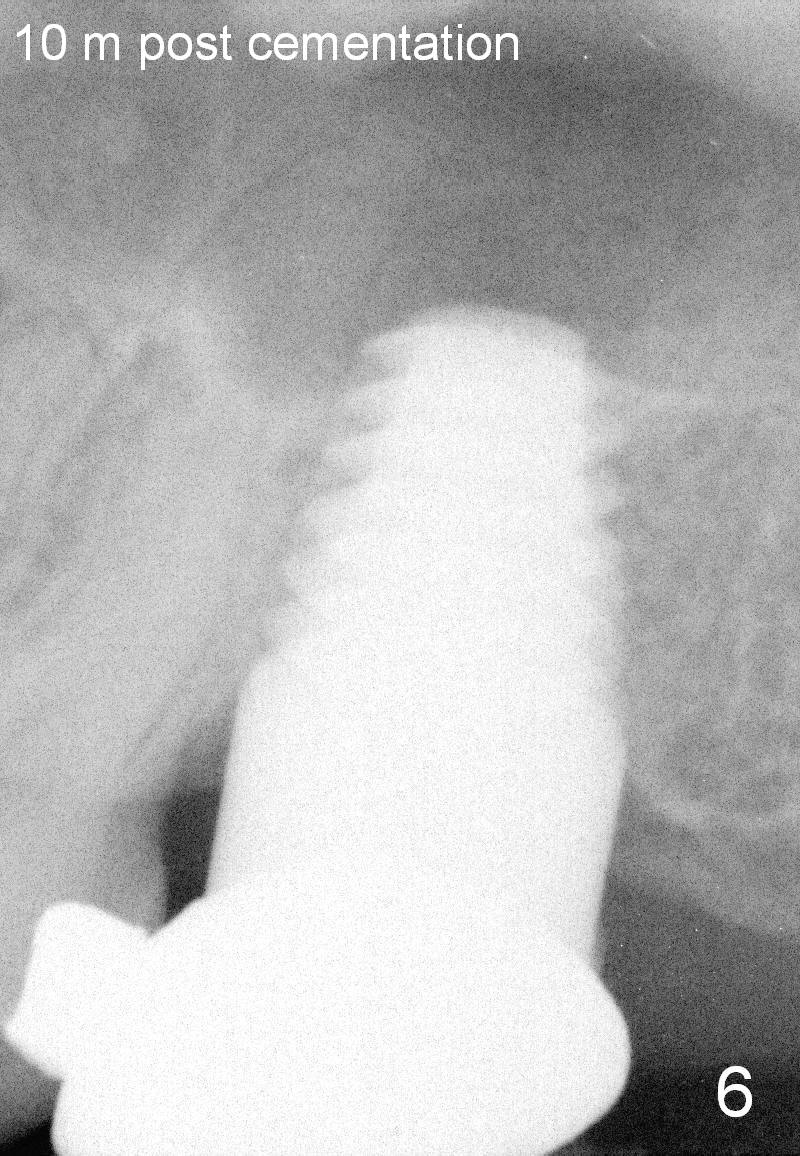 Four and a half months postop, bone resorption is slightly more severe (Fig.4) than immediately postop (Fig.3). Fig.5 is taken 1.5 weeks post cementation. Bone resorption appears to be halted 10 months (Fig.6) and 1.5 years (Fig.7) post cementation, respectively. The implant threads remain unexposed 4 years 4 months (Fig.8) and 5 years 4 months post cementation.