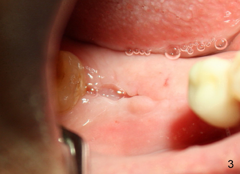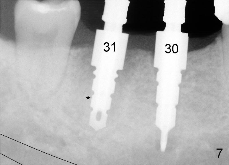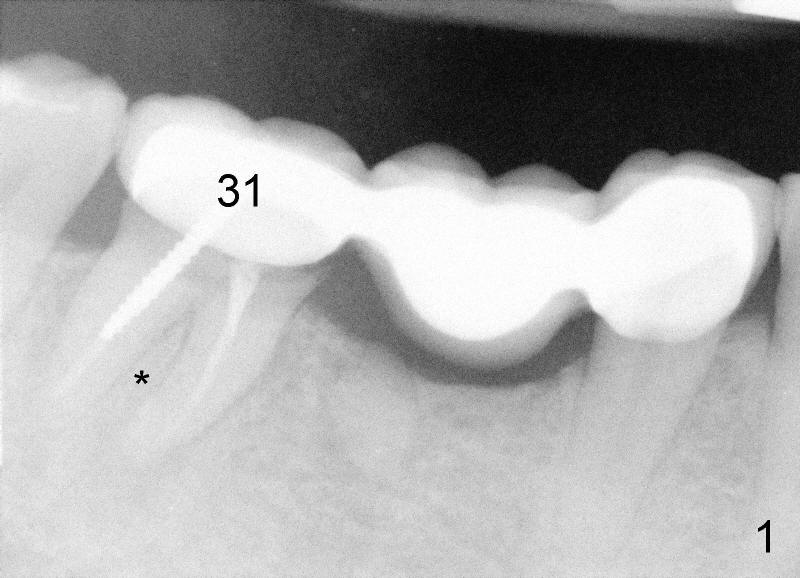 Fifty-three year old man complains that he has difficulty eating in the lower right quadrant. Exam shows that there is 2nd caries underneath #31 retainer and that there is a residual root under #30 pontic (Fig.1). * indicates the septum between the mesial and distal roots of the abutment #31. The teeth #30 and 31 are surgically extracted (Fig.2; *: the septum of #31). A month later, the wound heals (Fig.3).
