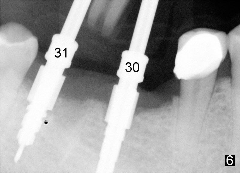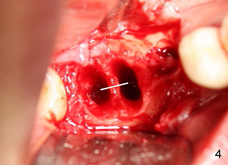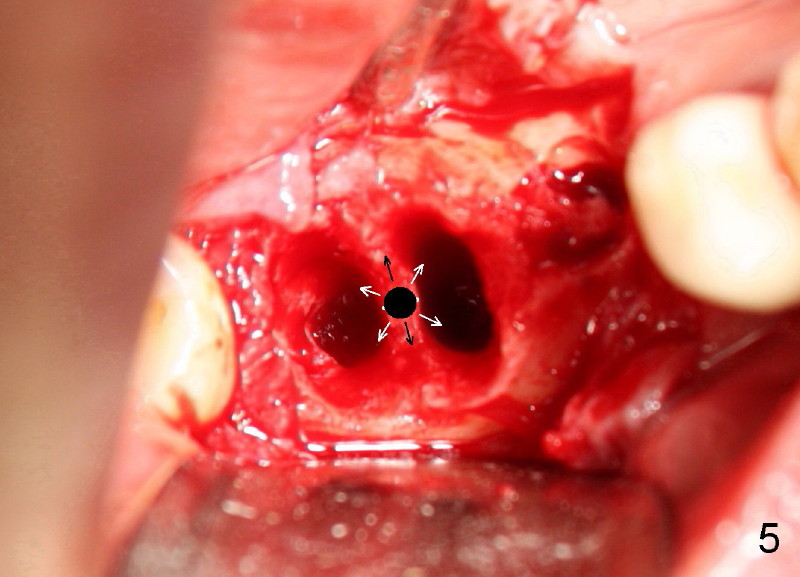 Six weeks post-extraction, a straight incision is made along the crest of #30/31. Without raising flap, #15 surgical blade, bone scalpels (4,5,6 mm wide) and bone blades (4,5.5,7.5 mm wide) ) (Fig.4 white line (illustration); Tatum Surgical) are used to expand the septum buccolingually (arrows). Then round tapered osteotomes (Fig.5 black circle (illustration)) are used to expand the septum circumferentially (arrows). Bone expansion with osteotomes alternates with sequential drills using irrigation. Fig.6 shows 4x17 and 4x14 mm drills placed in sockets #30 and 31, respectively. It appears that osteotomies are placed somewhat distally. The drill #31 is distal to the septum (*).