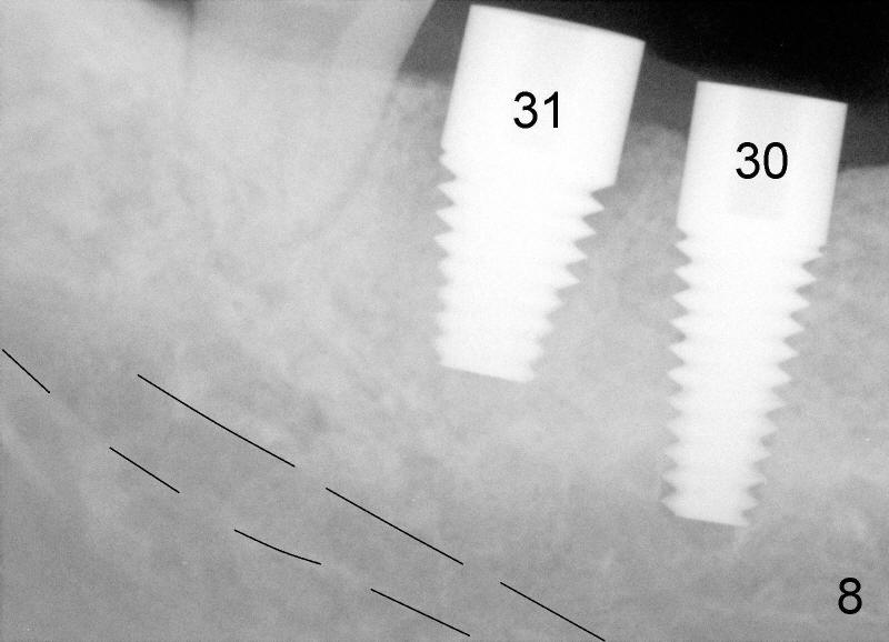 After adjustment, next drills (5x17, and 5x14 mm for #30 and 31) are located more appropriately relative to neighboring teeth (Fig.7) and also in some distance from the inferior alveolar canal (black lines). The septum of #31 is now distal to the drill for #31. Finally 6x17 and 7x14 mm Tatum tapered implants are placed with certain degree of initial stability (Fig.8). Black dashed lines represent the inferior alveolar canal. Fig.9 is taken immediately post-implant placement.