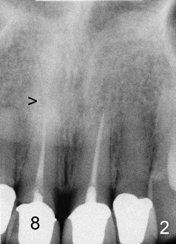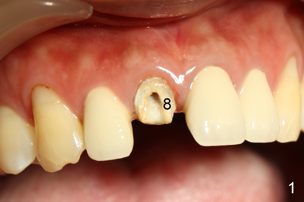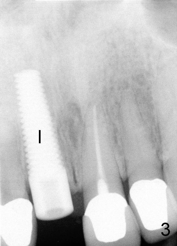 A 44-year-old lady has fractured #8 and agrees to have the tooth extracted after failure of recementation (Fig.1). Pre-implantation X-ray shows minimal periapical radiolucency (Fig.2: >). A 5x20 Tatum tapered implant is placed immediately after extraction (Fig.3: I). Perio dressing is placed and a flipper is delivered.