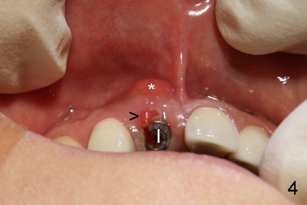Sixteen days after surgery, the patient returned with chief complaint "I do not have pain, but there is a swelling". Exam shows that there is localized apical swelling with + fluctuance (Fig.4: *) and granulation tissue at gingival margin (>). Under local anesthesia, I & D is performed with sanguine exudate, buccal apical plate perforation with implant threads exposed. Tetracycline normal saline is used for irrigation. The patient was asked to return every 1-2 days for irrigation.