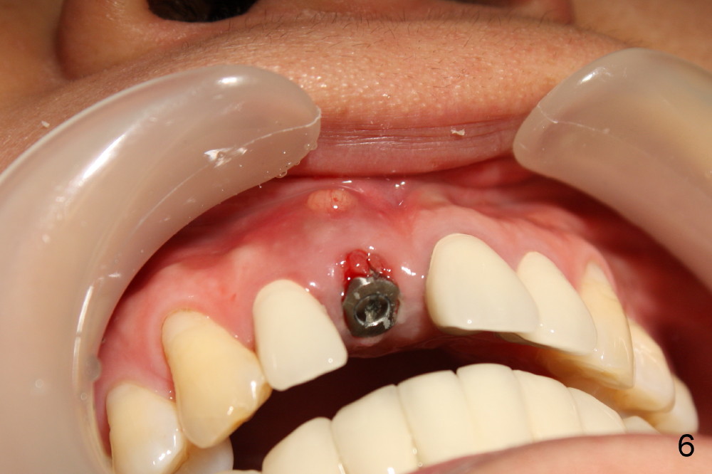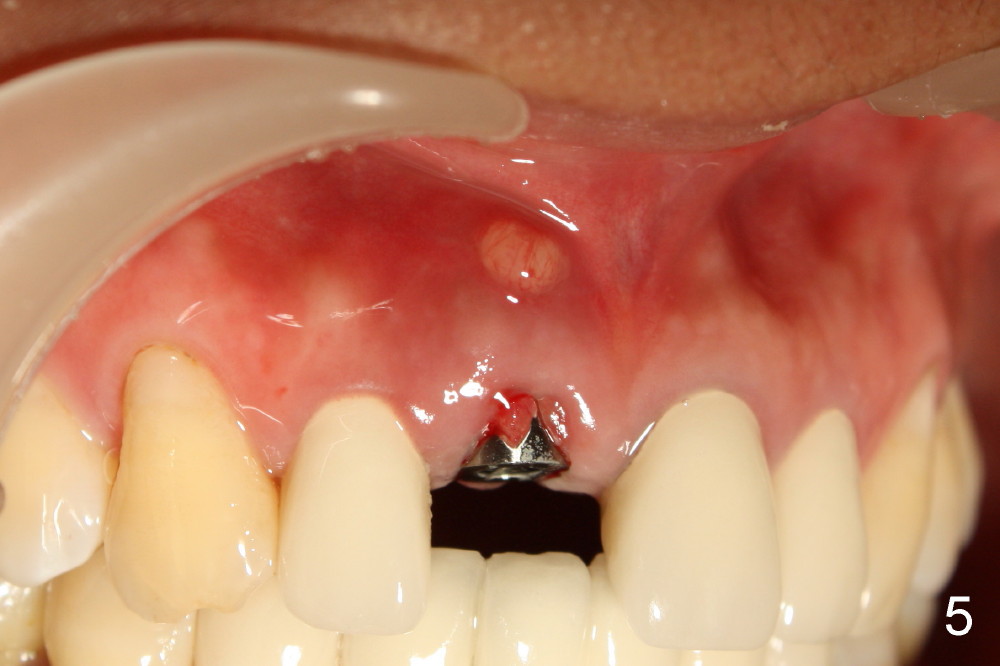 The patient felt better after I & D. She did not return for irrigation until ten days later (for Christmas). I & D incision heals. Swelling and granulation tissue re-appear (Fig.5,6). In two visits, the implant is stable.
