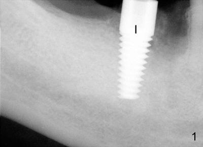 In fact, the inferior alveolar nerve (IAN) was injured during osteotomy. Although the implant was placed without impingement upon the nerve, it was placed supragingivally (Fig.2: I). Medrol dose pack was prescribed. The patient was reluctant to take pain reliever or antibiotic. Mouth rinse was not suggested.