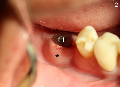 Postop, the patient developed both hyperthesia (pain) and paresthesia for about a week. Oral hygiene was almost abandoned due to pain. When he returned for postop infection treatment, scaling was done with irrigation of hydrogen peroxide between the implant and swollen gingiva before photography (Fig.2). In brief, when IAN injury is suspected intraop, the implant should be placed not only short of injured IAN, but also submerged to reduce contamination. The second point develops after surgery is finished. Postop, pain control and oral hygiene should be maintained.