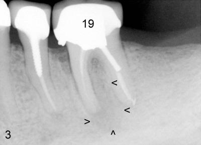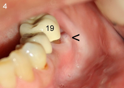 When attention was turned to the left side of this patient, chronic infection was noticed near the buccal furca of the tooth #19 (Fig.4: arrowhead). As a matter of fact, this type of infection has persisted for five years (Fig.3: arrowheads). Extraction of the tooth #19 has not been done because of mild and periodic discomfort. In contrast, signs and symptoms associated with the tooth #30 were more severe and acute, leading to extraction. Ideally, #19 should be extracted prior to or during #30 implant placement to prevent post-implant infection.