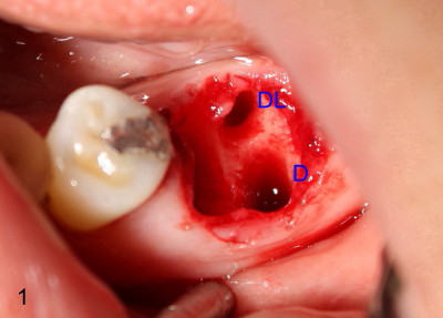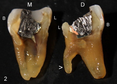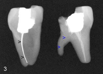 As discussed before, we plan to extract the affected tooth atraumatically by sectioning. When the distal portion of the tooth is taken out, there are two sockets distally (D, DL in Fig.1). There is an extra distal root (arrowhead in Fig.2). The mesial (M) and distal (D) portions of the tooth are laid out so that the buccal (B) is placed outside, lingual (L) inside of the photo. We are seeing the sectioned surfaces of the tooth. With the same arrangement, PA is taken (Fig.3). The silver cone (black arrowheads) is off the center of the mesial root, suggesting missing mesiolingual canal. The second missing canal, distolingual (blue arrowheads) is narrow and highly curvy. In fact the mesiolingual canal is also obliterated. It takes effort and time to go through it (Fig.4 black arrowhead). The distolingual canal is so obliterated that perforation is the end result (using rotary file) (blue arrowheads).