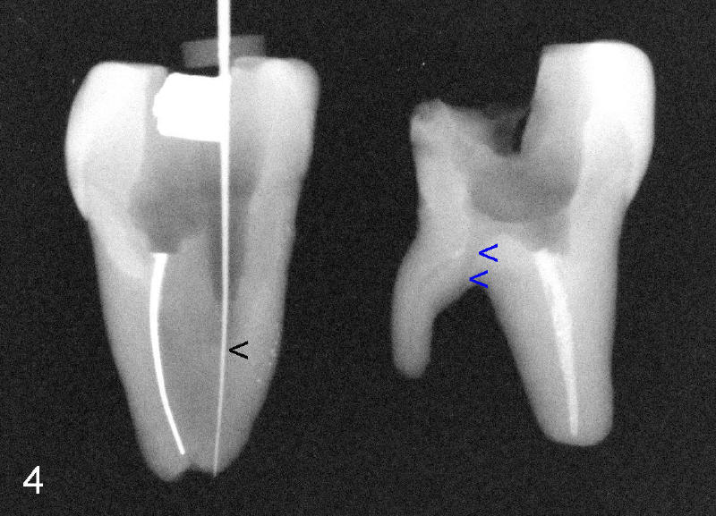 Fig.4: the distolingual canal is so obliterated that perforation is the end result (using rotary file) (blue arrowheads), back to main text