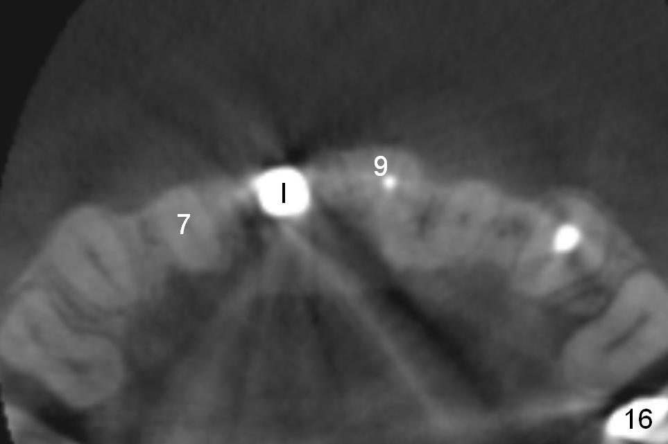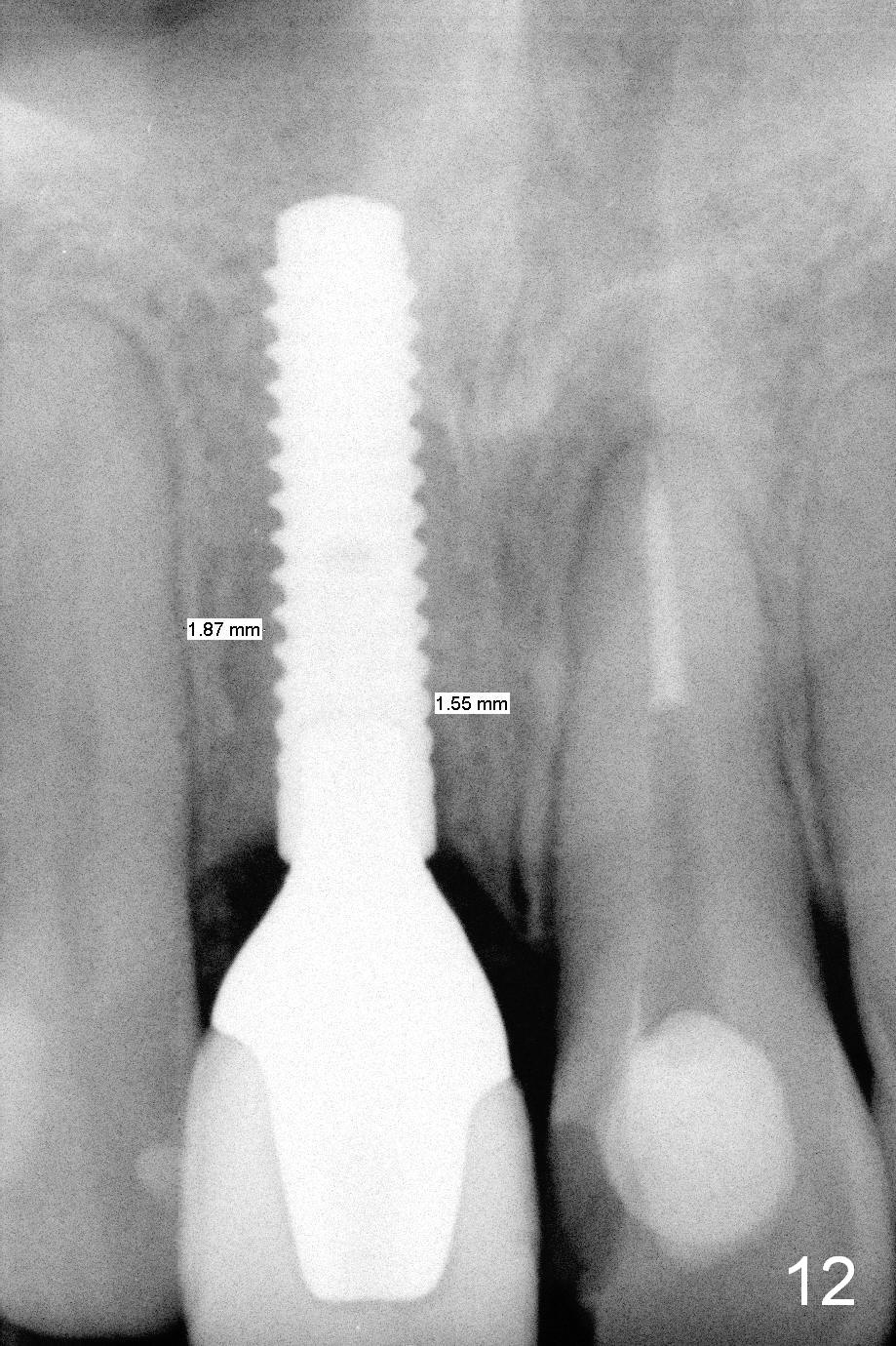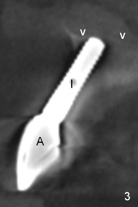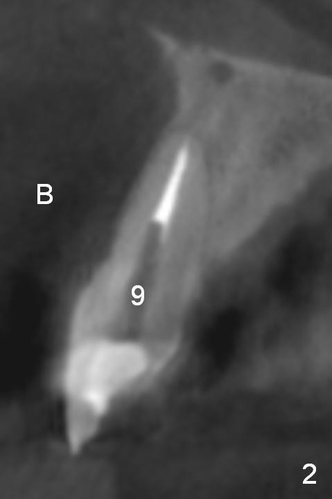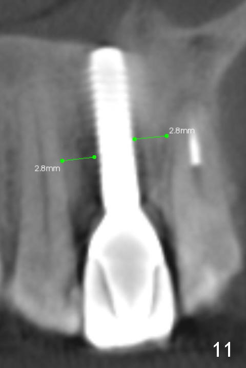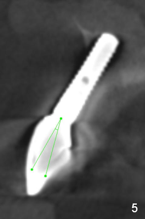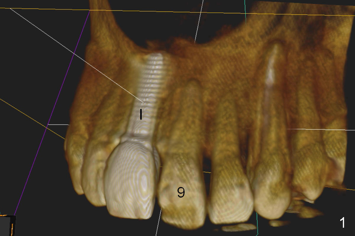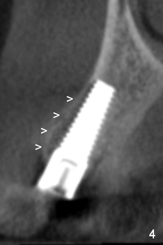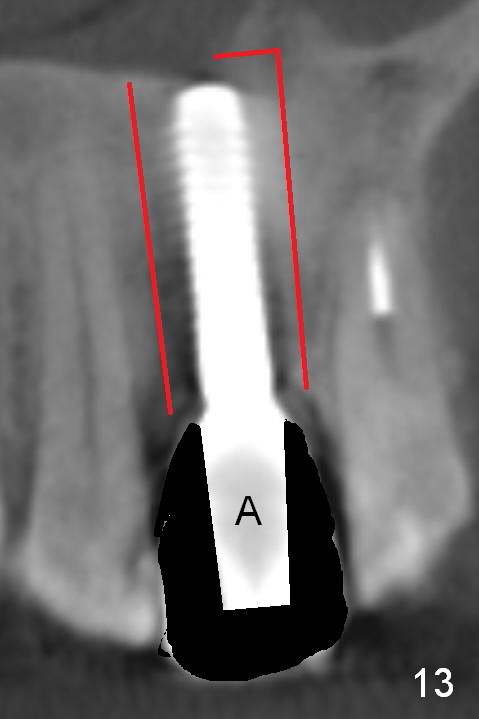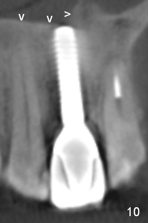 The implant at the site of #8, which was placed ~ 2 years ago, appears devoid of bone buccally (Fig.1 (CBCT 3 D image) I). Fig.2,3 are coronal sections of the tooth #9 (B: buccal) and 8 (A: Zirconium abutment), respectively. Fig.4 is a coronal section of the tooth #5 post-immediate implant with the bone plate (>, different case). With placement of a 15° Titanium abutment (Fig.5 palatal green line), the crown profile may improve.