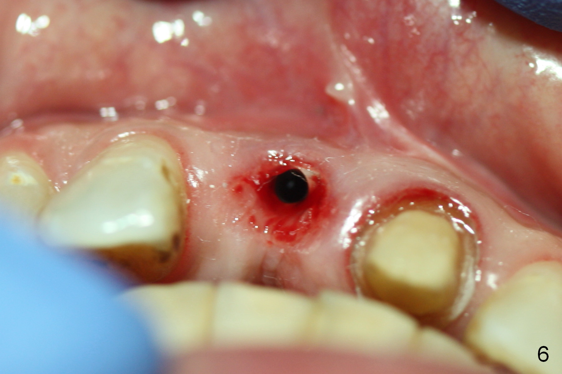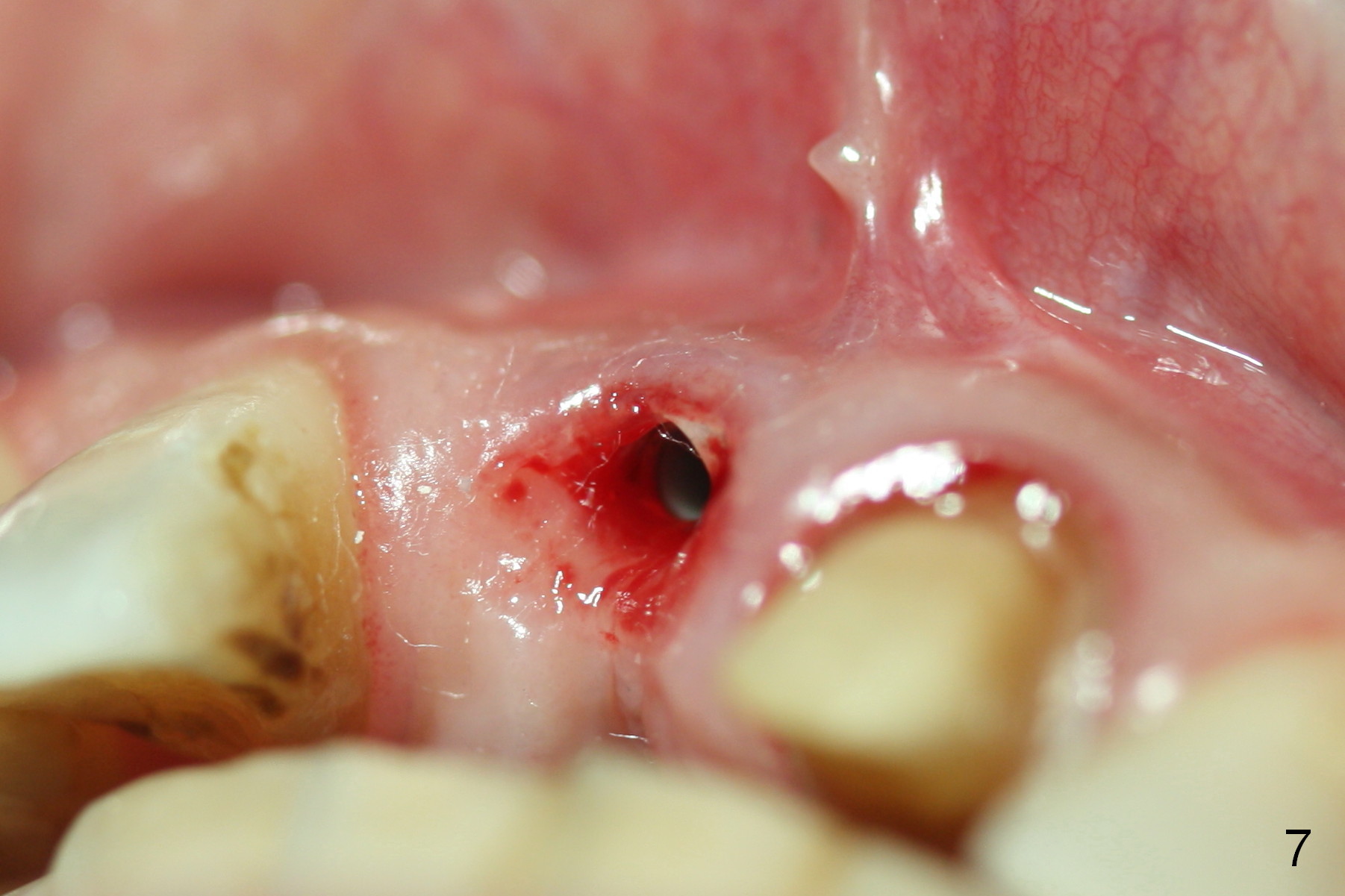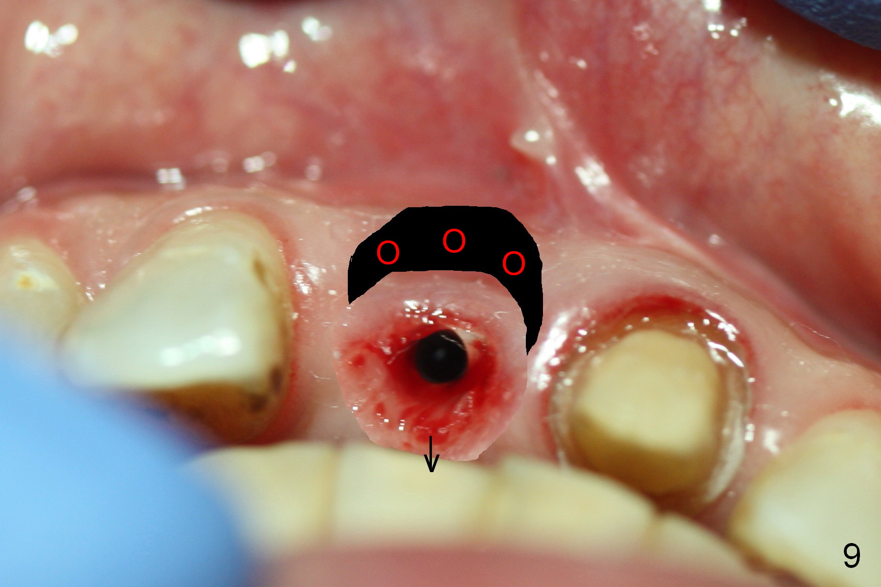 Fig.6,7 were taken a month ago when the Zirconium abutment was fractured, showing the position of the coronal end of the implant. To retrieve the abutment, an envelop incision will be made (Fig.8) with elevation of the buccal flap for the best visibility. Prepare abutment removing drivers (x3) and try in vitro. To improve cosmetics, the implant/bone segment seems to be required to be lingualized ~3 mm (Fig.9 arrow) with bone graft buccally (red circles, possibly chin graft).