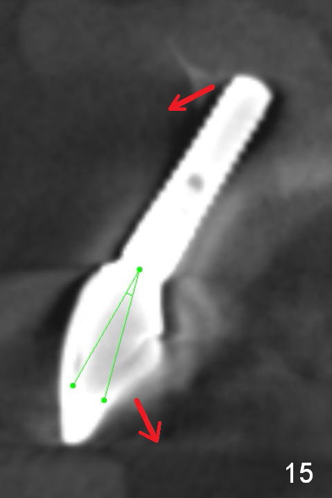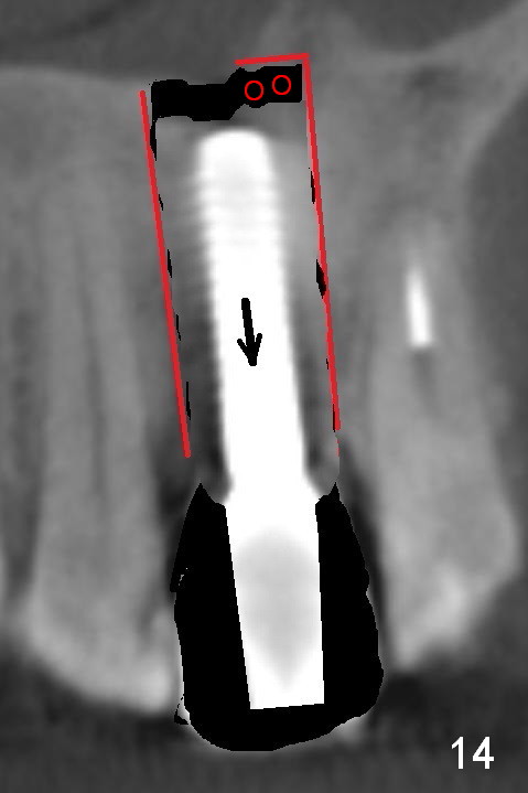 Fig.10 is a sagittal section of the implant (arrowheads: nasal floor). It is apparent that there is enough space (Fig.11,12 (PA)) for osteotomy (Fig.13 red lines: A: angled Titanium abutment). With the palatal mucoperiosteal flap attached the implant/bone segment, it is moved apically (Fig.14). Coronally the coronal portion is repositioned palatally while the apical portion buccally (Fig.15 arrows). Is the segment stable?