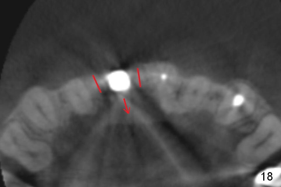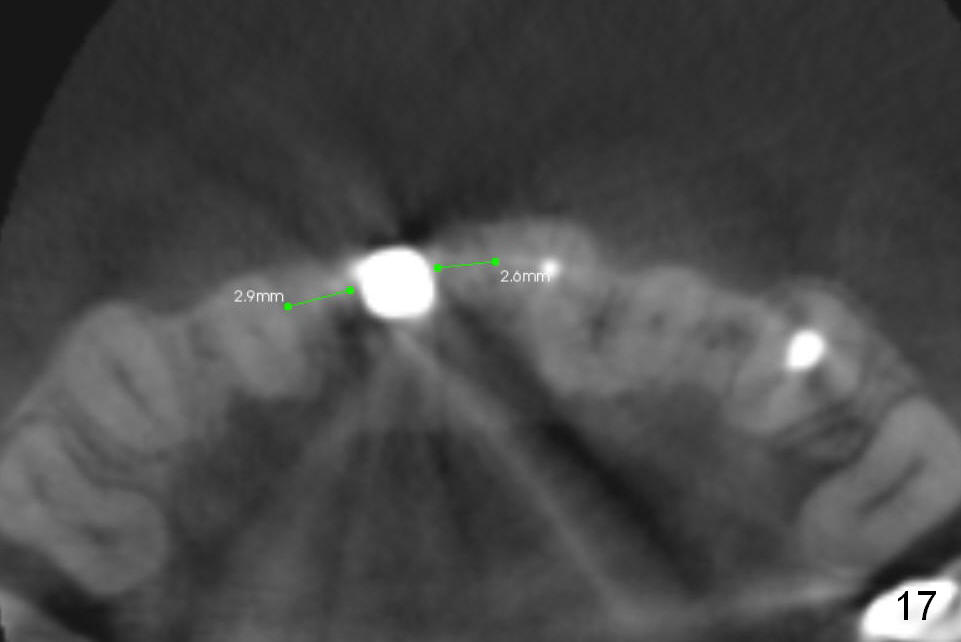 Fig.16 is an axial section of the maxilla. There is sufficient space (Fig.17) for osteotomy (Fig.18 red lines) for repositioning (Fig.18 arrow).