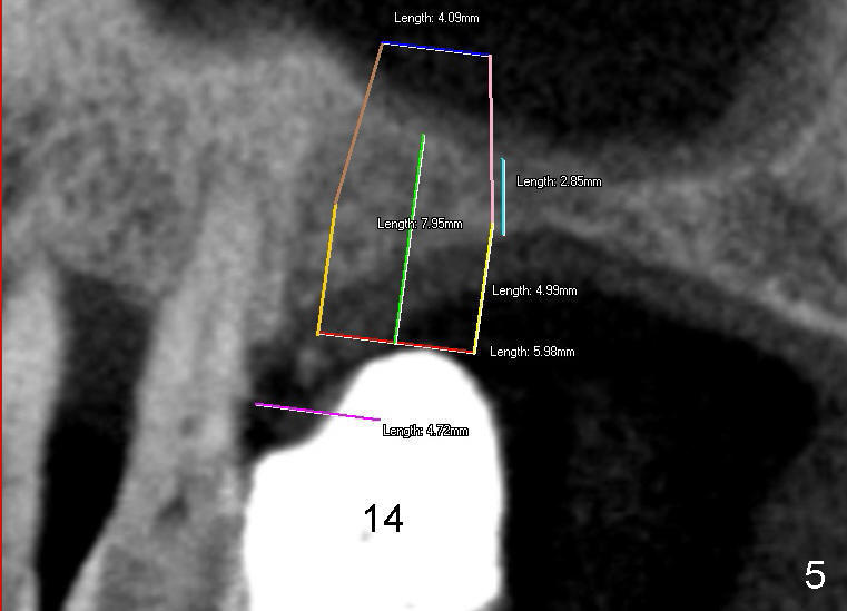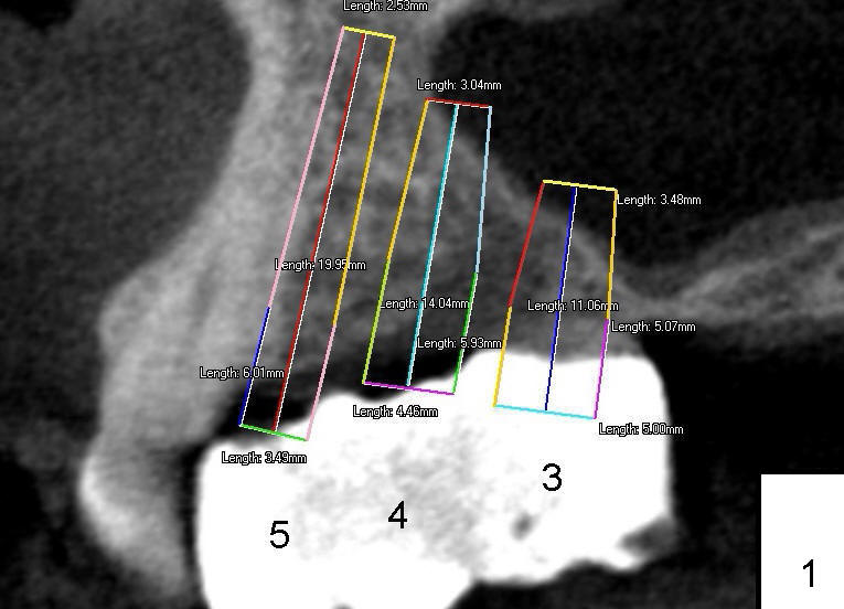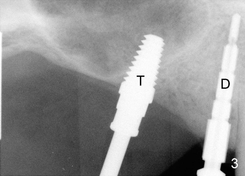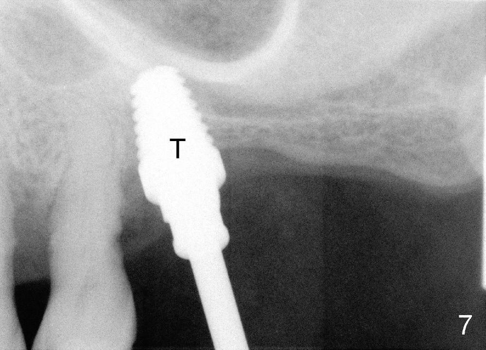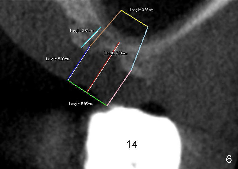 Mr. Wu (54 years old) is also scared of dentistry. He postpones implants for several years. One day he decides to get implant treatment. Easy placement is tried at the sites of #21 and then #7 (Fig.2). He is doing fine postop on both these occasions. Attention is turned to the site of #14 with 2.85 mm bone in height distally (Fig.5 CT sagittal section). The white area represents the crown at the site of #14 (CT scan stent). The coronal section also shows limited bone height (~3 mm) (Fig.6). A 6x11 mm tapered implant is planned to get as large as implant/bone surface area, particularly the mesial aspect (Fig.5,6). Tatum bone expansion technique is used to created osteotomy (#15 blade, BS 4-6 mm, BB 4-10 mm at the depth ~8 mm, RT 2-5 mm at 11 mm, no drill). A 6x11 mm tapered tap is applied (Fig.7 T). It appears that the tap tilts mesially. Adjustment of trajectory is made with RP, RB 4-5 mm at 11 mm and 7x11 mm tapered tap (with resistance). The corresponding implant is placed with >60 Ncm (Fig.8; distal bone quite narrow (between arrowheads). The patient is doing great a month postop with no sign of infection or mobility.