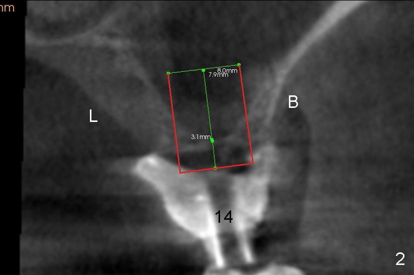 In order to get primary stability, it is apparent that a large screw implant should be placed (Fig.1,2: 8x11 mm) to engage all of the lateral walls of the concave sinus floor (mesial and distal (Fig.1), buccal and lingual (Fig.2 B, L). Three millimeter shorter implant may be more appropriate (8x8 mm) in term of being less traumatic.