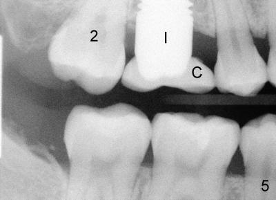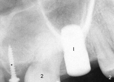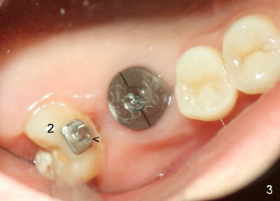 Fig.3 shows the implant 3 months post placement. It is not placed too superficial. The tooth #2 appears to be more distalized (using a lingual button as mesial fixed point (Fig.3 <)) than that in Fig.2.
