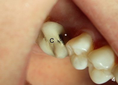 After crown cementation, the patient moves to Washington DC. She returns on vacation to replace PFM crown (Fig.4 C) with chip (*). Fig.5 shows a new Emax crown (C) after cementation. What is the most troubling is that there is cracking sound during cementation. The patient calls from DC, reporting that there is minor chipping. It is planned to fabricate a Zirconia crown next time she returns for visit in Atlanta.