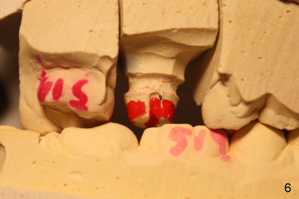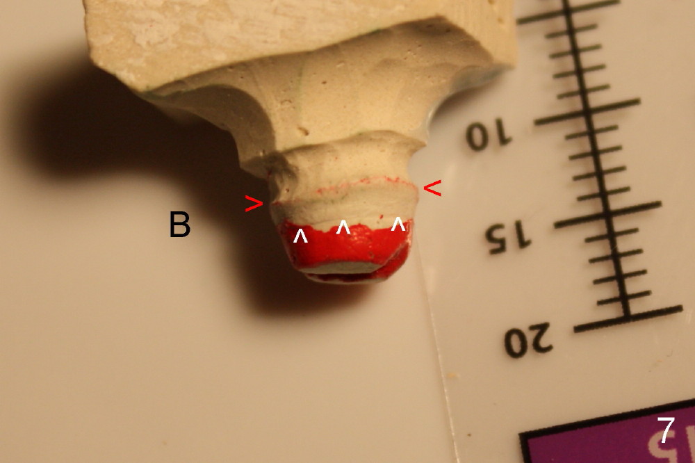 Fig.6 and 7 show the die in buccal and mesial views, respectively. Red arrowheads in Fig.7 indicate the crown margin that rests on the implant, whereas the white arrowheads point to the junction of the implant and the abutment. It appears that the height of the abutment is approximately 2 mm (B: buccal).