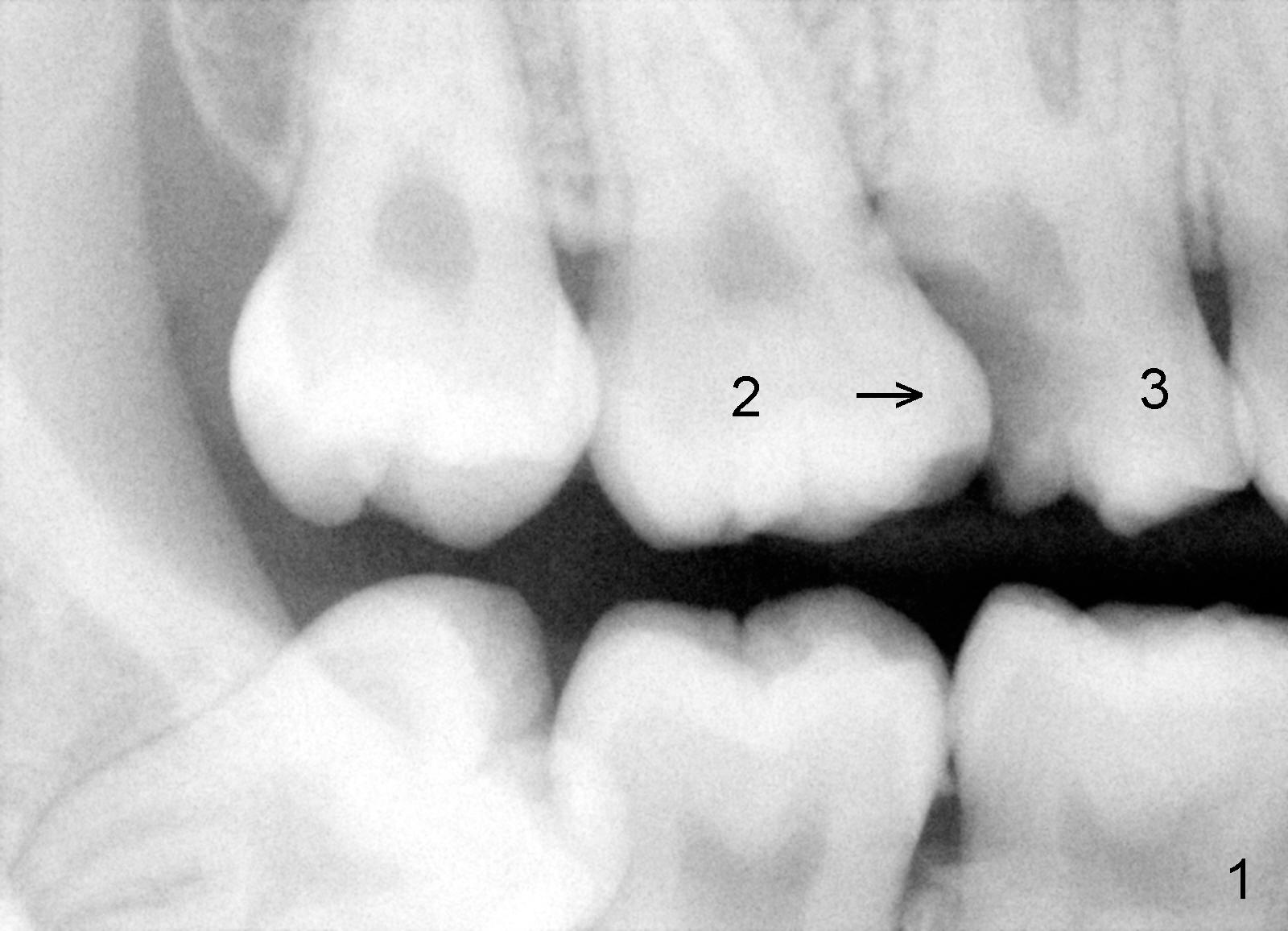 A 19-year-old female requests implant replacement for the tooth #3 (Fig.1). Due to large defect of the carious lesion on #3, the tooth #2 has shifted mesially (arrow).