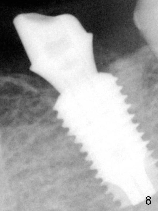 The patient returns for restoration 13 months postop with implant osteointegration (Fig.8). The lamina dura-like structure forms between the cortex and the coronal first thread.