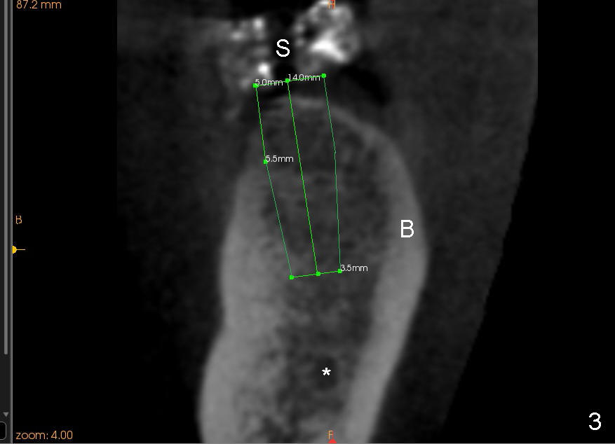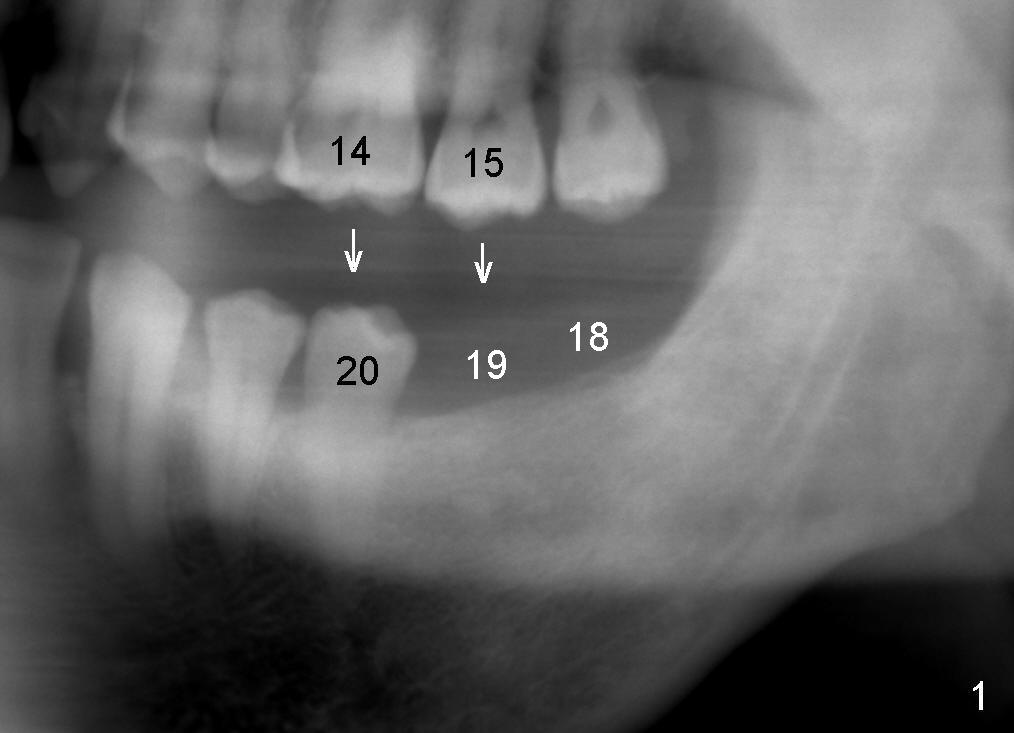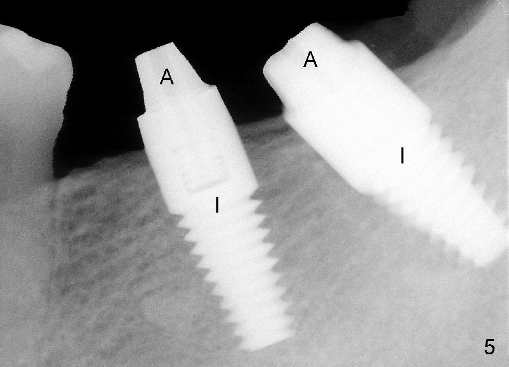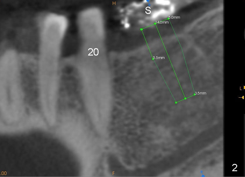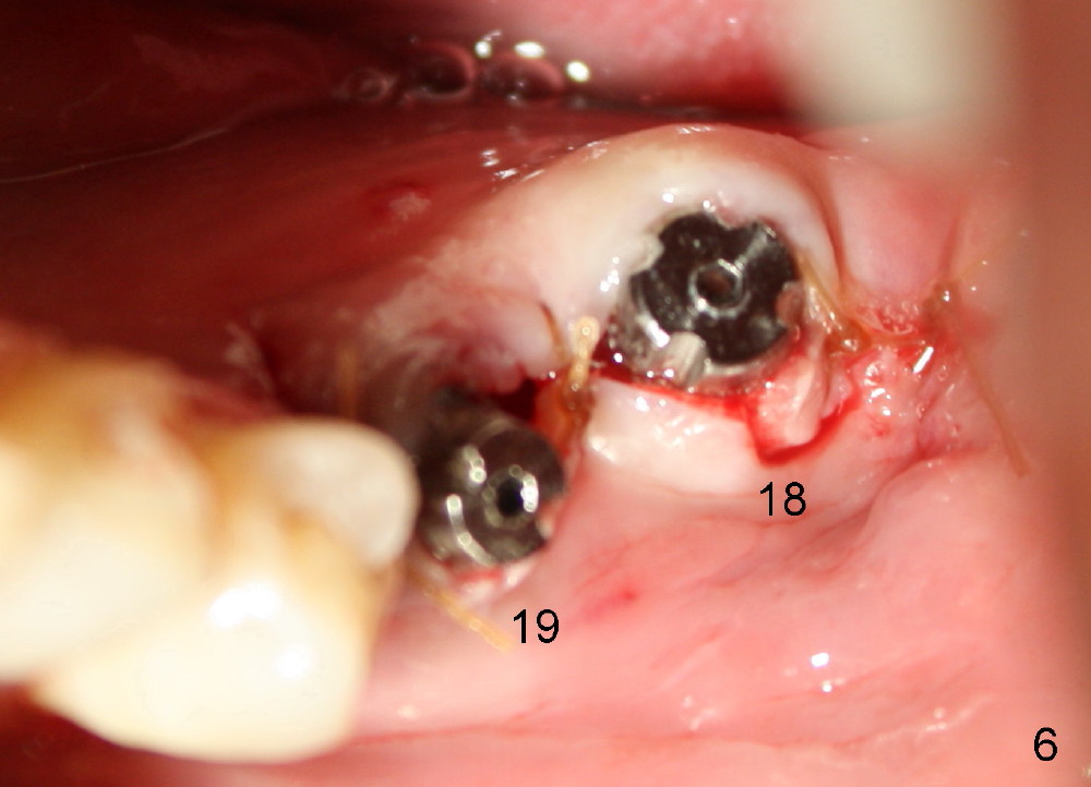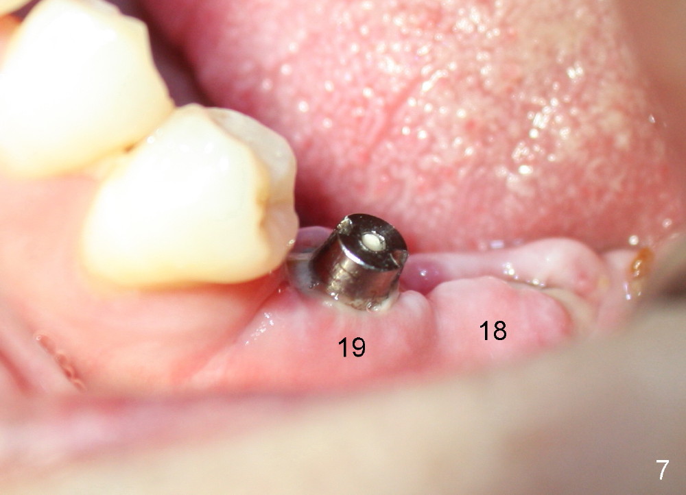 A 45-year-old man is a smoker (half pack a day). He returns for perio maintenance every 3 months. The teeth #18 and 19 have been extracted for long with supraeruption of #14 and 15 (Fig.1 arrows). CT confirms sufficient bone height (Fig.2) and width (Fig.3). Bone density is type II, as shown by CT and drilling. Relatively short implants are placed as deep as possible considering supraeruption of the opposing teeth (Fig.4 (4.5x14 and 5x14 mm taps at sites of #19 and 18, respectively) and Fig.5 (5x14 mm and 6x14 mm gingiva-level implants (I)). In order to avoid damaging the submandibular fossa, the implant at the site of #18 is tilted lingually (Fig.6). When short abutments (3 mm in height) are placed, there is enough clearance to place perio dressing. The abutment at the site of #18 becomes prematurely loose. It has to be removed 4 days postop. There is no sign of infection. Perio dressing is removed by the patient 7 days postop. He returns to clinic 8 days postop (Fig.7) for the remaining abutment to be removed. The wound appears to be healing normally.