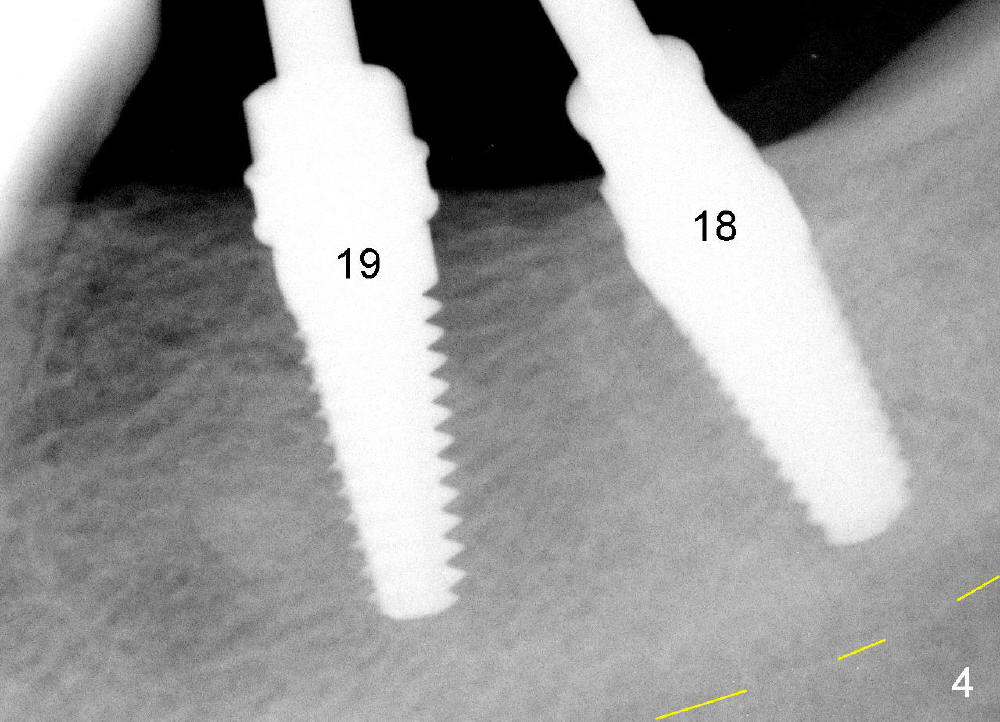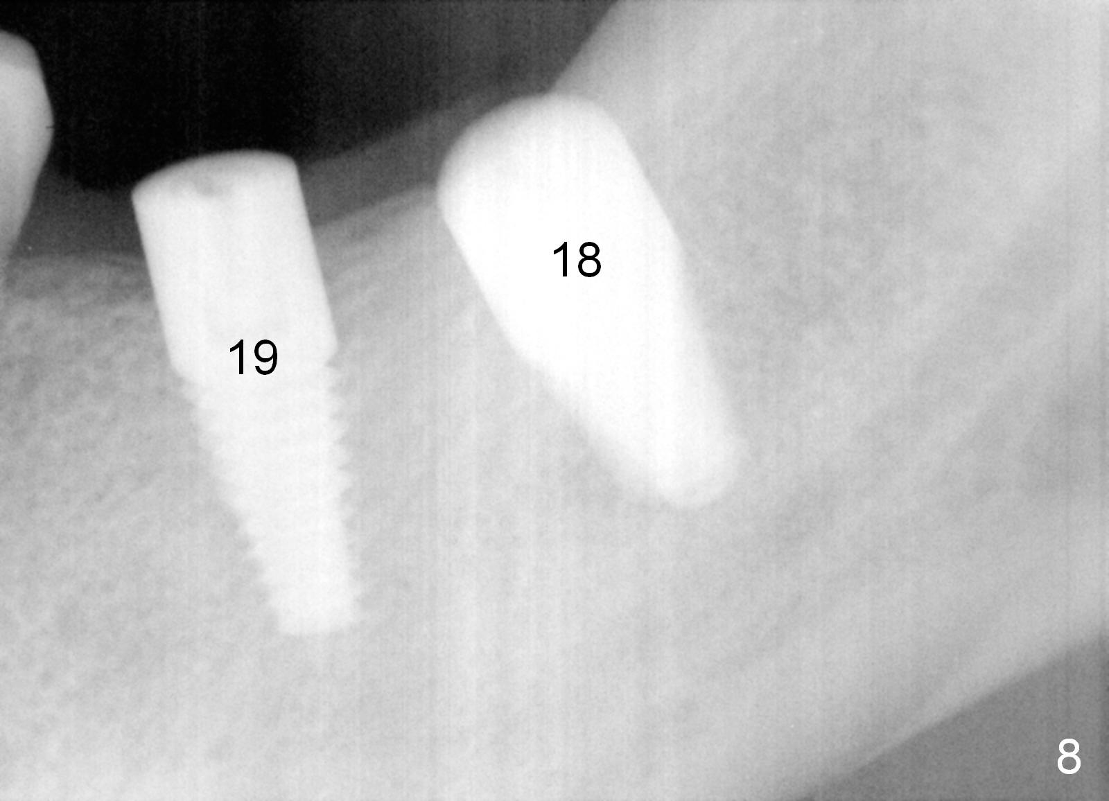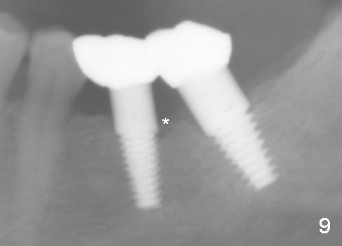 There is no bone loss around the implants 3 months postop (Fig.8). Crowns are delivered 5 months postop and have been in function for 3 months now. There is no gingival recession around the crowns. Panoramic X-ray is taken 1.5 years postop (1 year 1 month post cementation, Fig.9); there is mild bone resorption distal to #19 implant (*).