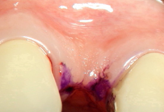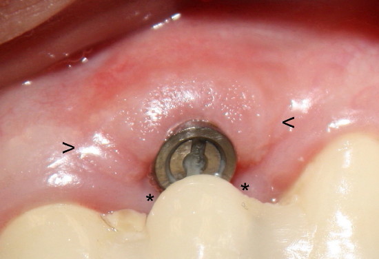 Three weeks post-operatively, a thick band of gingiva with stippling forms in the labial aspect of the implant (between arrowheads in Fig.5, as compared to the gingiva in the edentulous region pre-operatively in Fig.6). In addition, the gingiva is also closing the wound in the lingual aspect the implant (* in Fig.5), back to main article