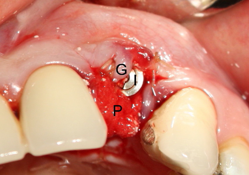 D1 implant (4x16 mm) is placed (I), there is extra gingiva (G) buccally, whereas